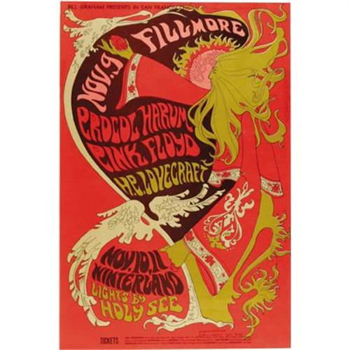<B>Procol Harum/Pink Floyd Fillmore/Winterland Concert Poster BG-92 (Bill Graham, 1967).</B></I> This very attractive poster, featuring a trio of fine psych/progressive rock bands (H. P. Lovecraft was the third on the bill), was only printed once. This example would grade at NM, save for some masking tape residue on the back of the poster, which has begun to seep through the upper front edges, and a very minor lower right corner crunch. Poster now grades VG+, and measures 14" x 21".<BR><BR><b>Shipping:</b> Framed - with Glass, Medium (<a target="_blank" href="http://www.heritageauctions.com/common/shipping.php">view shipping information</a>)