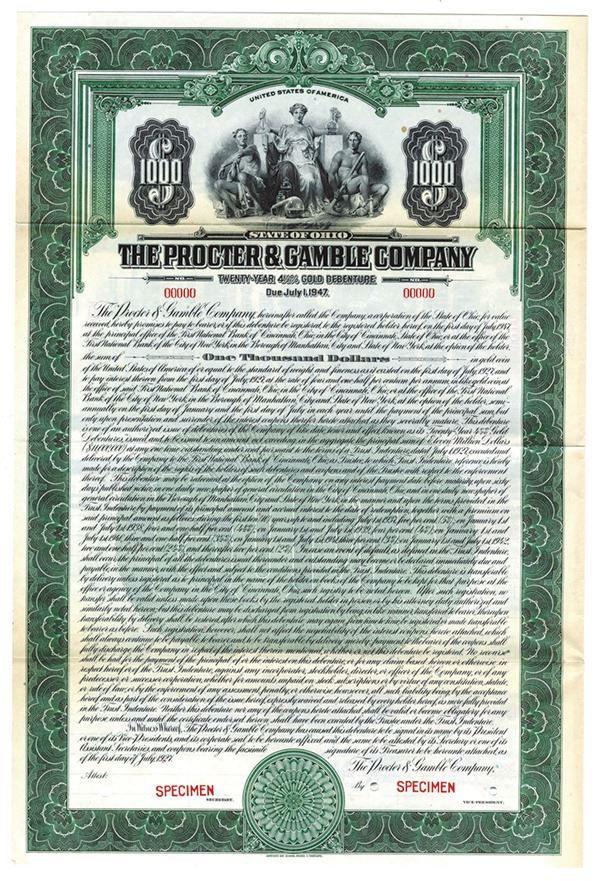 Ohio. $1000 4 1/2% Gold Debenture Coupon Bond, Black print on green border and under tint, Allegorical figures sitting together at top, Specimen overprints and POC's, VF-XF condition, ABNC.