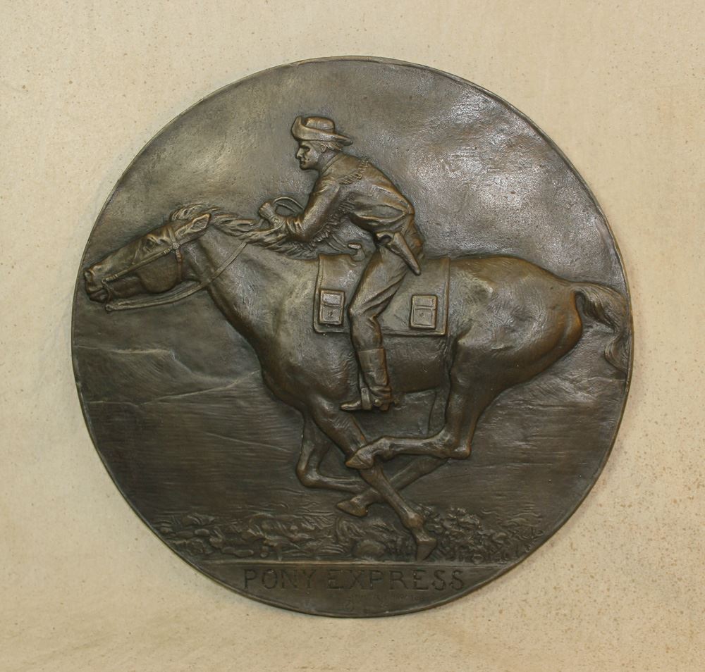 Alexander Phiminister Procter (Am: 1862-1950) Wells Fargo commissioned this plaque for the 50th Anniversary of the Pony Express in 1910. The 17" diameter bronze plaque shows a Pony Express rider on horseback riding at a gallop to his next station. The plaque is signed at lower center by Procter under the Pony Express logo. This plaque is listed in the Bergmann Book of Bronzes, and numbered 4759.