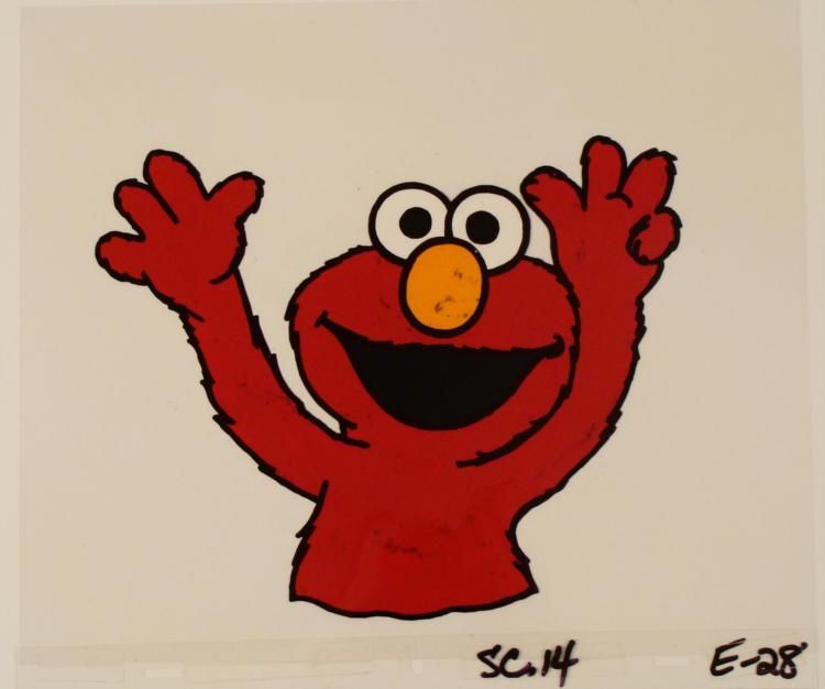 In Elmo's world everyone is happy and full of laughter. Elmo enjoys making friends and having a good time. In the cel, Elmo is shaking back and forth Original Animation Cel Medium: Hand painted acetate celDetails: Animation notations and peg holes Size of cel: 10 1/2 x 12 1/2 inchesCondition: Very good This is an original hand-painted cel set-up used in the production of an episode of "Sesame Street." Each one-of-a-kind set-up represents a slight change in position of the characters. When individually photographed and projected in rapid succession, the images appear to move. To create production cels, the original animator's drawing is transferred onto an acetate cel (by hand-inking and/or photo copying). The cel is then hand-painted on the reverse side. The cel has some slight paint fade to the outline.