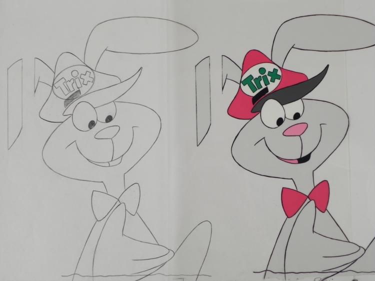 In this cel/drawing, the Trix rabbit is filled with joy. This original animation cel & drawing are from the production of the Trix cereal commercial. * * * * * * Original Animation Cel & DrawingMedium: Hand painted acetate celDetails: Animation notations and peg holes * * Original "rough" animation drawing, in non-photo blue and black pencil * * Size of cel: 10 1/2 x 12 1/2 inchesSize of drawing: 10 1/2 x 12 1/2 inches * * Condition: Very good * This is an original hand-painted cel set-up used in the production of the "Trix Cereal Commercial." Each one-of-a-kind set-up represents a slight change in position of the characters. When individually photographed and projected in rapid succession, the images * appear to move. To created production cels, the original animator's drawing is transferred onto an acetate cel (by hand-inking and/or photo copying). The cel is then hand-painted on the reverse side. * * * * * Traditional animation is a multi-step process which includes various types of art techniques. Drawings are a key part of the process, in which the animator creates the design and movement of the characters. Drawings are then transferred onto acetate cels (by * hand-inking and/or photo copying) to create a production cel, which is then hand painted on the back side, using paint colors chosen and approved by the creator of the series.