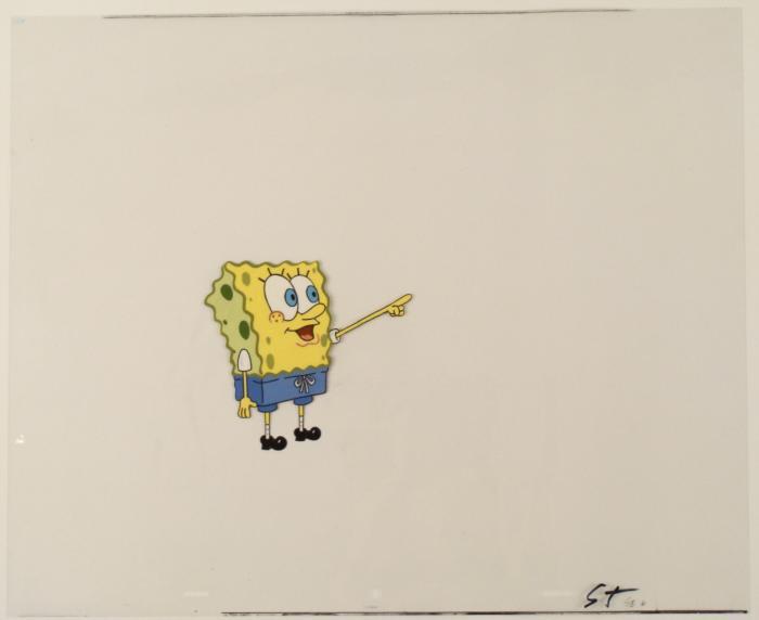 This original animation cel is from the Nickelodeon TV show SpongeBob Squarepants. The story takes place under the deep blue sea in Bikini Bottom, where SpongeBob resides. SpongeBob, who is a yellow, porous sponge, is your typical happy-go-lucky character, as he is always cheerful and enjoys making people laugh. Patrick Star, SpongeBob's neighbor who is a starfish, is your average children's show idiot, as he boasts knowing nothing and is often getting himself into ridiculous situations. Between the homes of these two lies the home of the miserable Squidward, a squid, who is known for being grouchy and playing tricks on SpongeBob and Patrick. Both SpongeBob and Squidward work at the Krusty Krab, a fast food business run by the greedy money-loving Mr. Krabs, a crab, the arch rival of the evil, possibly misunderstood, Plankton. Another neighbor, Sandy Cheeks, an athletic squirrel who normally wears an astronaut's space suit, was introduced in "Tea at the Treedome." She spends most of her time inventing and experimenting. Why is SpongeBob pointing?Original Production Animated Cel Overall Size of Cel: 13 1/2" x 16 1/2" Very Good ConditionThis is an original hand-painted cel set-up used in the production of an episode of "SpongeBob SquarePants." Each one-of-a-kind set-up represents a slight change in position of the characters. When individually photographed and projected in rapid succession, the images appear to move.