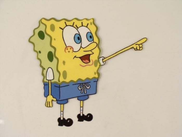 This original animation cel is from the Nickelodeon TV show SpongeBob Squarepants. The story takes place under the deep blue sea in Bikini Bottom, where SpongeBob resides. SpongeBob, who is a yellow, porous sponge, is your typical happy-go-lucky character, as he is always cheerful and enjoys making people laugh. Patrick Star, SpongeBob's neighbor who is a starfish, is your average children's show idiot, as he boasts knowing nothing and is often getting himself into ridiculous situations. Between the homes of these two lies the home of the miserable Squidward, a squid, who is known for being grouchy and playing tricks on SpongeBob and Patrick. Both SpongeBob and Squidward work at the Krusty Krab, a fast food business run by the greedy money-loving Mr. Krabs, a crab, the arch rival of the evil, possibly misunderstood, Plankton. Another neighbor, Sandy Cheeks, an athletic squirrel who normally wears an astronaut's space suit, was introduced in "Tea at the Treedome." She spends most of her time inventing and experimenting. Why is SpongeBob pointing?Original Production Animated Cel Overall Size of Cel: 13 1/2" x 16 1/2" Very Good ConditionThis is an original hand-painted cel set-up used in the production of an episode of "SpongeBob SquarePants." Each one-of-a-kind set-up represents a slight change in position of the characters. When individually photographed and projected in rapid succession, the images appear to move.