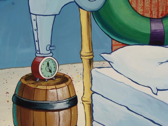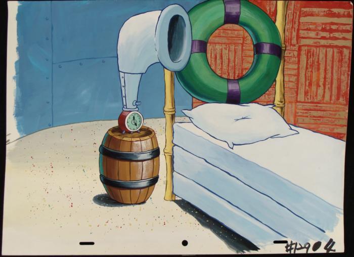 This original hand-painted background from the Nickelodeon TV show SpongeBob Squarepants. The story takes place under the deep blue sea in Bikini Bottom, where SpongeBob resides. SpongeBob, who is a yellow, porous sponge, is your typical happy-go-lucky character, as he is always cheerful and enjoys making people laugh. Patrick Star, SpongeBob's neighbor who is a starfish, is your average children's show idiot, as he boasts knowing nothing and is often getting himself into ridiculous situations. Between the homes of these two lies the home of the miserable Squidward, a squid, who is known for being grouchy and playing tricks on SpongeBob and Patrick. Both SpongeBob and Squidward work at the Krusty Krab, a fast food business run by the greedy money-loving Mr. Krabs, a crab, the arch rival of the evil, possibly misunderstood, Plankton. Another neighbor, Sandy Cheeks, an athletic squirrel who normally wears an astronaut's space suit, was introduced in "Tea at the Treedome." She spends most of her time inventing and experimenting. Depicted here is someone's bedroom with one big alarm clock.Original Production Background Overall Size of Background: 10 1/2" x 14 1/4" Very good condition; it has been stored Original Production Backgrounds are used in the making of the final version of animated productions. The background establishes the location and the overall good mood of the scenee. Typically, a background layout artist creates a drawing to establish the content of the scene, placement of characters, perspective and camera angle. Based on this drawing, the background artist creates a preliminary painting to confirm all of the scenes details, then the final production background which is used in the filming of the scene. When these backgrounds are individually photographed behind the progression of production cels, and projected at a rapid succession, the images in the foreground appear to move, creating an animated scene. The background is ready to be matted and framed. It is a colored background with the animator's notations at the bottom.