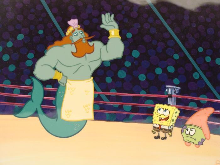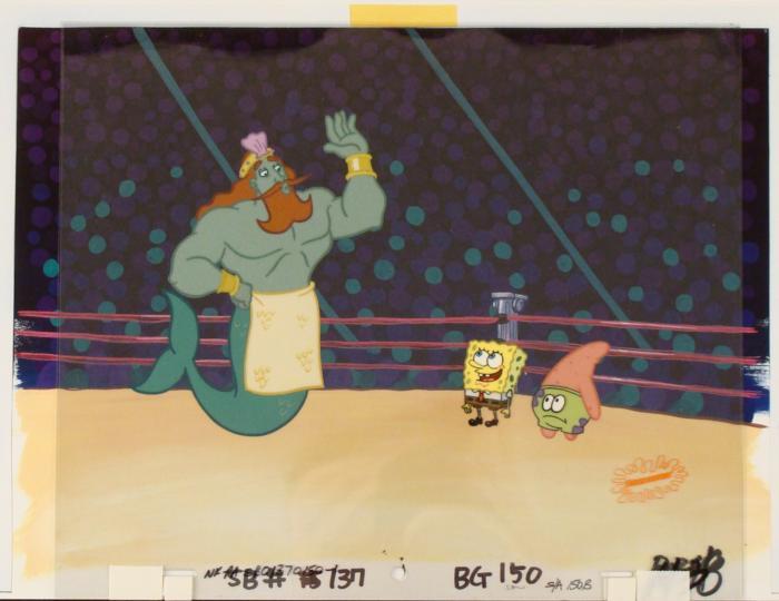 This animation cel and reproduction background are from the Nickelodeon TV show SpongeBob Squarepants. The story takes place under the deep blue sea in Bikini Bottom, where SpongeBob resides. SpongeBob, who is a yellow, porous sponge, is your typical happy-go-lucky character, as he is always cheerful and enjoys making people laugh. Patrick Star, SpongeBob's neighbor who is a starfish, is your average children's show idiot, as he boasts knowing nothing and is often getting himself into ridiculous situations. Between the homes of these two lies the home of the miserable Squidward, a squid, who is known for being grouchy and playing tricks on SpongeBob and Patrick. Both SpongeBob and Squidward work at the Krusty Krab, a fast food business run by the greedy money-loving Mr. Krabs, a crab, the arch rival of the evil, possibly misunderstood, Plankton. Another neighbor, Sandy Cheeks, an athletic squirrel who normally wears an astronaut's space suit, was introduced in "Tea at the Treedome." She spends most of her time inventing and experimenting. King Neptune and SpongeBob are talking to each other.Original Printed Background and Animated Cel Overall Size of Background: 11" x 17" Overall Size of the Cel: 10 1/2" x 12 1/2" Very good condition This is an original hand-painted cel set-up used in the production of an episode of "SpongeBob SquarePants." Each one-of-a-kind set-up represents a slight change in position of the characters. When individually photographed and projected in rapid succession, the images appear to move.
