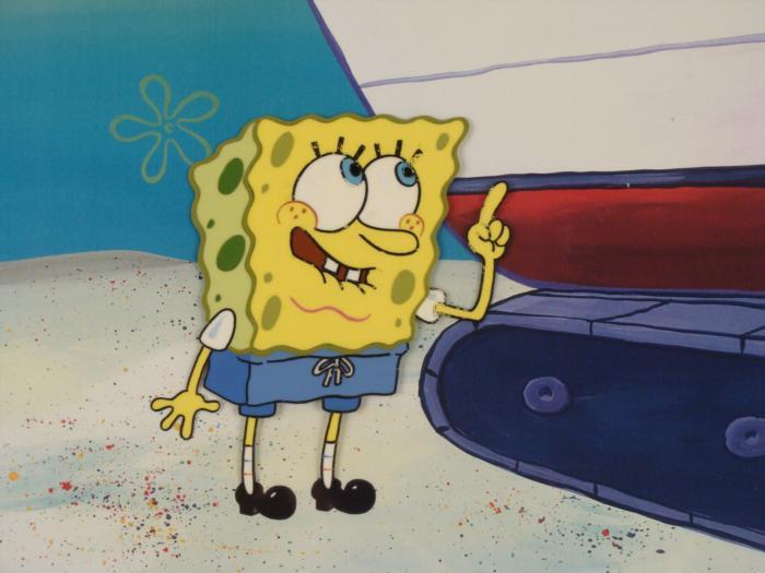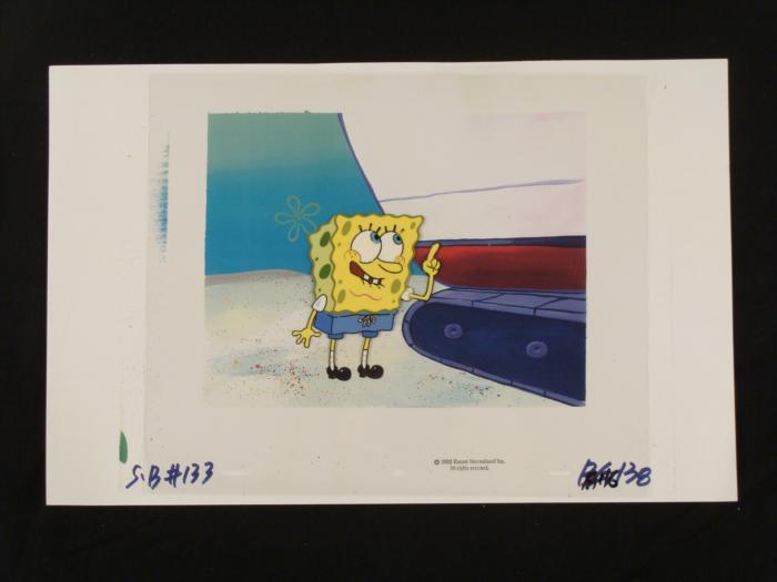 This original hand-painted background and animation cel is from the Nickelodeon TV show SpongeBob Squarepants. The story takes place under the deep blue sea in Bikini Bottom, where SpongeBob resides. SpongeBob, who is a yellow, porous sponge, is your typical happy-go-lucky character, as he is always cheerful and enjoys making people laugh. Patrick Star, SpongeBob's neighbor who is a starfish, is your average children's show idiot, as he boasts knowing nothing and is often getting himself into ridiculous situations. Between the homes of these two lies the home of the miserable Squidward, a squid, who is known for being grouchy and playing tricks on SpongeBob and Patrick. Both SpongeBob and Squidward work at the Krusty Krab, a fast food business run by the greedy money-loving Mr. Krabs, a crab, the arch rival of the evil, possibly misunderstood, Plankton. Another neighbor, Sandy Cheeks, an athletic squirrel who normally wears an astronaut's space suit, was introduced in "Tea at the Treedome." She spends most of her time inventing and experimenting. Why is SpongeBob holding up his finger?Original Production Background and Animated Cel Overall Size of Background: 11" x 17" Overall Size of the Cels: 10 1/2" x 12 1/2" Very good condition; it has been stored This is an original hand-painted cel set-up used in the production of an episode of "SpongeBob SquarePants." Each one-of-a-kind set-up represents a slight change in position of the characters. When individually photographed and projected in rapid succession, the images appear to move.