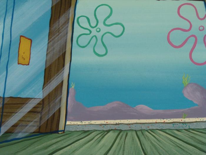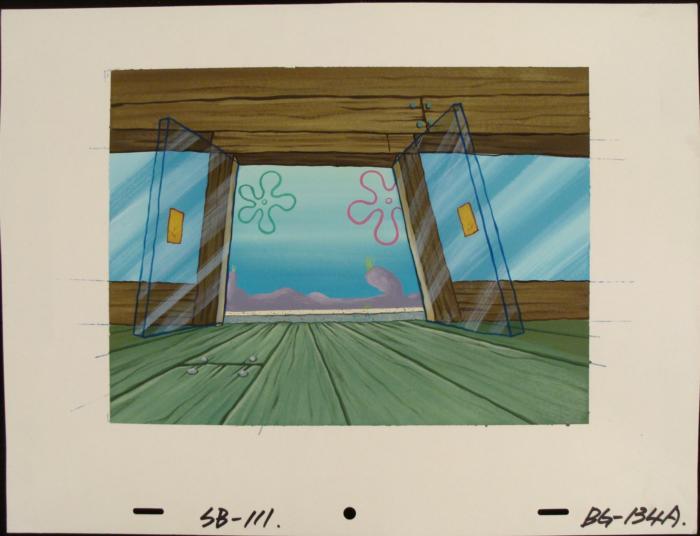 This original hand-painted background from the Nickelodeon TV show SpongeBob Squarepants. The story takes place under the deep blue sea in Bikini Bottom, where SpongeBob resides. SpongeBob, who is a yellow, porous sponge, is your typical happy-go-lucky character, as he is always cheerful and enjoys making people laugh. Patrick Star, SpongeBob's neighbor who is a starfish, is your average children's show idiot, as he boasts knowing nothing and is often getting himself into ridiculous situations. Between the homes of these two lies the home of the miserable Squidward, a squid, who is known for being grouchy and playing tricks on SpongeBob and Patrick. Both SpongeBob and Squidward work at the Krusty Krab, a fast food business run by the greedy money-loving Mr. Krabs, a crab, the arch rival of the evil, possibly misunderstood, Plankton. Another neighbor, Sandy Cheeks, an athletic squirrel who normally wears an astronaut's space suit, was introduced in "Tea at the Treedome." She spends most of her time inventing and experimenting. The doors are now openOriginal Production Background Overall Size of Background: 10 1/2" x 13 3/4" Very good conditionOriginal Production Backgrounds are used in the making of the final version of animated productions. The background establishes the location and the overall good mood of the scenee. Typically, a background layout artist creates a drawing to establish the content of the scene, placement of characters, perspective and camera angle. Based on this drawing, the background artist creates a preliminary painting to confirm all of the scenes details, then the final production background which is used in the filming of the scene. When these backgrounds are individually photographed behind the progression of production cels, and projected at a rapid succession, the images in the foreground appear to move, creating an animated scene. The background is ready to be matted and framed. It is a colored background with the animator's notations at the bottom.