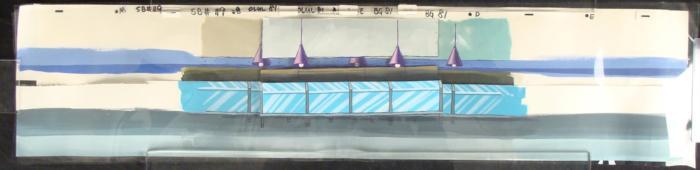 To create production cels, the original animator's drawing is transferred onto an acetate cel (by hand-inking and/or photo copying). The cel is then hand-painted on the reverse side. The background accompanying this set-up is a hand-painted original production background. The background is ready to be matted and framed. It is a colored background with a cel and has the animator's notations at the bottom of the background. The cel is multilayered: the first cel is a short serving counter, the second is heat lamps and a wooden panel, and the third is of a long serving counter. On each cel, the art work is on paper, pasted to the cel. The background is in two parts taped together