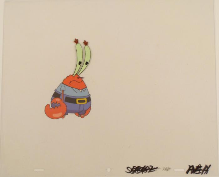 This original animation cel is from the Nickelodeon TV show SpongeBob Squarepants. The story takes place under the deep blue sea in Bikini Bottom, where SpongeBob resides. SpongeBob, who is a yellow, porous sponge, is your typical happy-go-lucky character, as he is always cheerful and enjoys making people laugh. Patrick Star, SpongeBob's neighbor who is a starfish, is your average children's show idiot, as he boasts knowing nothing and is often getting himself into ridiculous situations. Between the homes of these two lies the home of the miserable Squidward, a squid, who is known for being grouchy and playing tricks on SpongeBob and Patrick. Both SpongeBob and Squidward work at the Krusty Krab, a fast food business run by the greedy money-loving Mr. Krabs, a crab, the arch rival of the evil, possibly misunderstood, Plankton. Another neighbor, Sandy Cheeks, an athletic squirrel who normally wears an astronaut's space suit, was introduced in "Tea at the Treedome." She spends most of her time inventing and experimenting. Mr. Krabs is staring at something.Original Production Animated Cel Overall Size of Cel: 10 1/2" x 12 1/2" Very Good ConditionThis is an original hand-painted cel set-up used in the production of an episode of "SpongeBob SquarePants." Each one-of-a-kind set-up represents a slight change in position of the characters. When individually photographed and projected in rapid succession, the images appear to move.