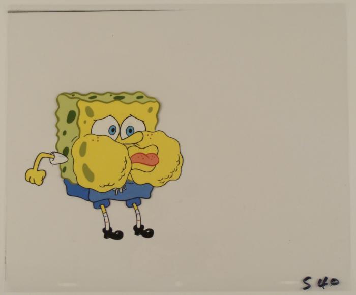This original animation cel is from the Nickelodeon TV show SpongeBob Squarepants. The story takes place under the deep blue sea in Bikini Bottom, where SpongeBob resides. SpongeBob, who is a yellow, porous sponge, is your typical happy-go-lucky character, as he is always cheerful and enjoys making people laugh. Patrick Star, SpongeBob's neighbor who is a starfish, is your average children's show idiot, as he boasts knowing nothing and is often getting himself into ridiculous situations. Between the homes of these two lies the home of the miserable Squidward, a squid, who is known for being grouchy and playing tricks on SpongeBob and Patrick. Both SpongeBob and Squidward work at the Krusty Krab, a fast food business run by the greedy money-loving Mr. Krabs, a crab, the arch rival of the evil, possibly misunderstood, Plankton. Another neighbor, Sandy Cheeks, an athletic squirrel who normally wears an astronaut's space suit, was introduced in "Tea at the Treedome." She spends most of her time inventing and experimenting. Due to the lack of oxygen, Spongebob's tongue is starting to stick out.Original Production Animated Cel Overall Size of Cel: 10 1/2" x 12 1/2" Excellent ConditionThis is an original hand-painted cel set-up used in the production of an episode of "SpongeBob SquarePants." Each one-of-a-kind set-up represents a slight change in position of the characters. When individually photographed and projected in rapid succession, the images appear to move.