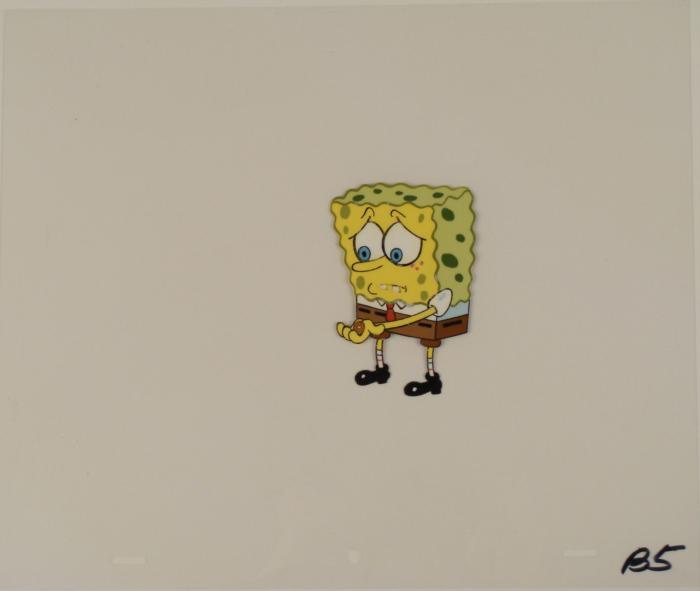 This original animation cel is from the Nickelodeon TV show SpongeBob Squarepants. The story takes place under the deep blue sea in Bikini Bottom, where SpongeBob resides. SpongeBob, who is a yellow, porous sponge, is your typical happy-go-lucky character, as he is always cheerful and enjoys making people laugh. Patrick Star, SpongeBob's neighbor who is a starfish, is your average children's show idiot, as he boasts knowing nothing and is often getting himself into ridiculous situations. Between the homes of these two lies the home of the miserable Squidward, a squid, who is known for being grouchy and playing tricks on SpongeBob and Patrick. Both SpongeBob and Squidward work at the Krusty Krab, a fast food business run by the greedy money-loving Mr. Krabs, a crab, the arch rival of the evil, possibly misunderstood, Plankton. Another neighbor, Sandy Cheeks, an athletic squirrel who normally wears an astronaut's space suit, was introduced in "Tea at the Treedome." She spends most of her time inventing and experimenting. Poor Spongebob, it appears that what he has to offer is no good. Original Production Animated Cel Overall Size of Cel: 10 1/2" x 12 1/2" Very good conditionThis is an original hand-painted cel set-up used in the production of an episode of "SpongeBob SquarePants." Each one-of-a-kind set-up represents a slight change in position of the characters. When individually photographed and projected in rapid succession, the images appear to move.