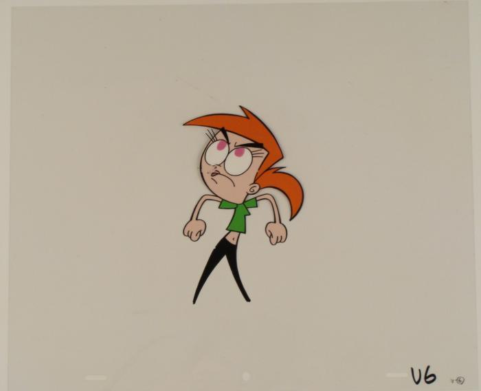 This original animation cel is from the Nickelodeon TV show Fairly Odd Parents. Timmy Turner is a short, buck-toothed 10-year-old boy with a pink cap who lives in Dimmsdale, a small suburban town with his dim-witted parents. His life is constantly miserable, due to the fact that his parents are rarely home and he is babysat by an incredibly evil teenager, Vicky, and that, generally, no one understands him (as indicated by the show's theme song). But everything changes when he receives two fairy parents: Cosmo and his wife, Wanda and later, their son Poof. Timmy learns that his fairy godparents are capable of granting him any wish he wants within certain limits. However, Timmy's immature nature causes him to sometimes ask for wishes that unintentionally result in disaster, and he and his fairy parents and fairy brother must find a way to "unwish" the wish.Original Production Animated Cel Overall Size of Cel: 10 1/2" x 12 1/2" Very Good ConditionThis is an original hand-painted cel set-up used in the production of an episode of "Fairly Odd Parents." Each one-of-a-kind set-up represents a slight change in position of the characters. When individually photographed and projected in rapid succession, the images appear to move.