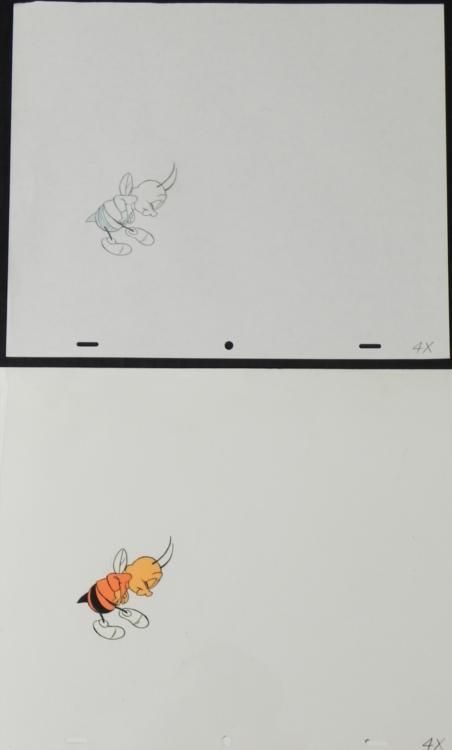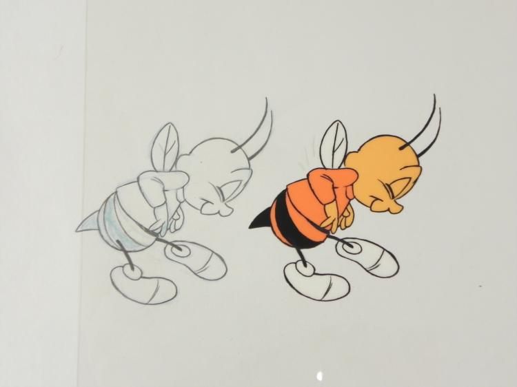 Good smile * * * Original Animation Cel & DrawingMedium: Hand painted acetate celDetails: Animation notations and peg holes * * Original "rough" animation drawing, in non-photo blue and black pencil * * Size of cel: 10 1/2 x 12 1/2 inchesSize of drawing: 10 1/2 x 12 1/2 inches * * Condition: Very good * This is an original hand-painted cel set-up used in the production of * the "Cheerios commercial." Each one-of-a-kind set-up represents a slight * change in position of the characters. When individually photographed * and projected in rapid succession, the images * appear to move. To created production cels, the original animator's * drawing is transferred onto an acetate cel (by hand-inking and/or photo * copying). The cel is then hand-painted on the reverse side.