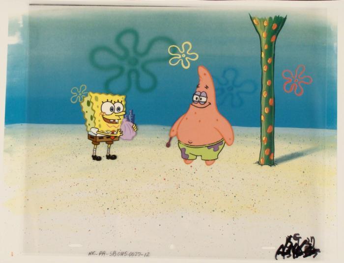 This animation cel and reproduction background are from the Nickelodeon TV show SpongeBob Squarepants. The story takes place under the deep blue sea in Bikini Bottom, where SpongeBob resides. SpongeBob, who is a yellow, porous sponge, is your typical happy-go-lucky character, as he is always cheerful and enjoys making people laugh. Patrick Star, SpongeBob's neighbor, is a starfish who boasts knowing nothing and is often getting himself into ridiculous situations. Between the homes of these two lies the home of the miserable Squidward, a squid, who is known for being grouchy and playing tricks on SpongeBob and Patrick. Both SpongeBob and Squidward work at the Krusty Krab, a fast food business run by the greedy money-loving Mr. Krabs, a crab, the arch rival of the evil, possibly misunderstood, Plankton. Another neighbor, Sandy Cheeks, an athletic squirrel who normally wears an astronaut's space suit, was introduced in "Tea at the Treedome." She spends most of her time inventing and experimenting. Patrick and SpongeBob have found a clam shell.Original Printed Background and Animated Cel Overall Size of Background: 11" x 17" Overall Size of the Cel: 10 1/2" x 12 1/2" Very good condition This is an original hand-painted cel set-up used in the production of an episode of "SpongeBob SquarePants." Each one-of-a-kind set-up represents a slight change in position of the characters. When individually photographed and projected in rapid succession, the images appear to move.