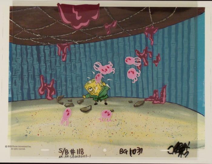 This animation cel and reproduction background are from the Nickelodeon TV show SpongeBob Squarepants.  The story takes place under the deep blue sea in Bikini Bottom, where SpongeBob resides. SpongeBob, who is a yellow, porous sponge, is your typical happy-go-lucky character, as he is always cheerful and enjoys making people laugh. Patrick Star, SpongeBob's neighbor who is a starfish, is your average children's show idiot, as he boasts knowing nothing and is often getting himself into ridiculous situations. Between the homes of these two lies the home of the miserable Squidward, a squid, who is known for being grouchy and playing tricks on SpongeBob and Patrick. Both SpongeBob and Squidward work at the Krusty Krab, a fast food business run by the greedy money-loving Mr. Krabs, a crab, the arch rival of the evil, possibly misunderstood, Plankton. Another neighbor, Sandy Cheeks, an athletic squirrel who normally wears an astronaut's space suit, was introduced in "Tea at the Treedome." She spends most of her time inventing and experimenting.  The jellyfish are stinging SpongeBob.Original Printed Background and Animated Cel Overall Size of Background:  11" x 17" Overall Size of the Cel: 10 1/2" x 12 1/2" Very good condition This is an original hand-painted cel set-up used in the production of an episode of "SpongeBob SquarePants." Each one-of-a-kind set-up represents a slight change in position of the characters. When individually photographed and projected in rapid succession, the images appear to move.