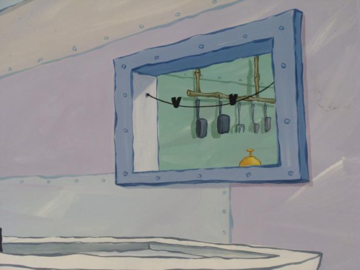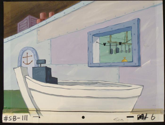 This original hand-painted background and animation cel are from the Nickelodeon TV show SpongeBob Squarepants. The story takes place under the deep blue sea in Bikini Bottom, where SpongeBob resides. SpongeBob, who is a yellow, porous sponge, is your typical happy-go-lucky character, as he is always cheerful and enjoys making people laugh. Patrick Star, SpongeBob's neighbor who is a starfish, is your average children's show idiot, as he boasts knowing nothing and is often getting himself into ridiculous situations. Between the homes of these two lies the home of the miserable Squidward, a squid, who is known for being grouchy and playing tricks on SpongeBob and Patrick. Both SpongeBob and Squidward work at the Krusty Krab, a fast food business run by the greedy money-loving Mr. Krabs, a crab, the arch rival of the evil, possibly misunderstood, Plankton. Another neighbor, Sandy Cheeks, an athletic squirrel who normally wears an astronaut's space suit, was introduced in "Tea at the Treedome." She spends most of her time inventing and experimenting. Where is everyone?Original Production Background and Animated Cel Overall Size of Background: 10 1/2" x 13 3/4" Overall Size of the Cel: 10 1/2" x 12 1/2" Very good condition; it has been stored This is an original hand-painted cel set-up used in the production of an episode of "SpongeBob SquarePants." Each one-of-a-kind set-up represents a slight change in position of the characters. When individually photographed and projected in rapid succession, the images appear to move.
