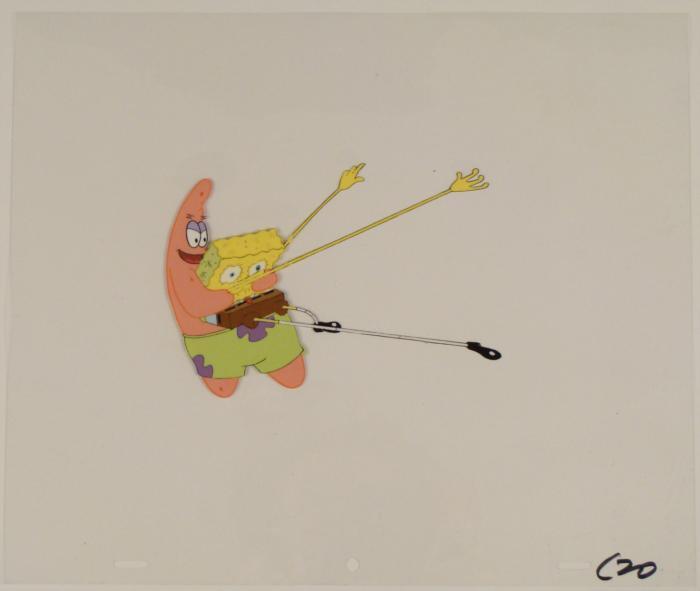 This original animation cel is from the Nickelodeon TV show SpongeBob Squarepants. The story takes place under the deep blue sea in Bikini Bottom, where SpongeBob resides. SpongeBob, who is a yellow, porous sponge, is your typical happy-go-lucky character, as he is always cheerful and enjoys making people laugh. Patrick Star, SpongeBob's neighbor who is a starfish, is your average children's show idiot, as he boasts knowing nothing and is often getting himself into ridiculous situations. Between the homes of these two lies the home of the miserable Squidward, a squid, who is known for being grouchy and playing tricks on SpongeBob and Patrick. Both SpongeBob and Squidward work at the Krusty Krab, a fast food business run by the greedy money-loving Mr. Krabs, a crab, the arch rival of the evil, possibly misunderstood, Plankton. Another neighbor, Sandy Cheeks, an athletic squirrel who normally wears an astronaut's space suit, was introduced in "Tea at the Treedome." She spends most of her time inventing and experimenting. Stop... Resisting...Original Production Animated Cel Overall Size of Cel: 10 1/2" x 12 1/2" Excellent ConditionThis is an original hand-painted cel set-up used in the production of an episode of "SpongeBob SquarePants." Each one-of-a-kind set-up represents a slight change in position of the characters. When individually photographed and projected in rapid succession, the images appear to move.