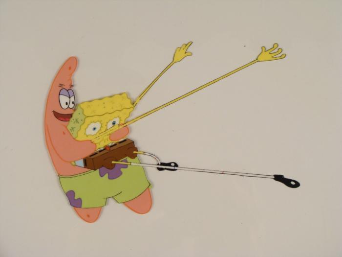 This original animation cel is from the Nickelodeon TV show SpongeBob Squarepants. The story takes place under the deep blue sea in Bikini Bottom, where SpongeBob resides. SpongeBob, who is a yellow, porous sponge, is your typical happy-go-lucky character, as he is always cheerful and enjoys making people laugh. Patrick Star, SpongeBob's neighbor who is a starfish, is your average children's show idiot, as he boasts knowing nothing and is often getting himself into ridiculous situations. Between the homes of these two lies the home of the miserable Squidward, a squid, who is known for being grouchy and playing tricks on SpongeBob and Patrick. Both SpongeBob and Squidward work at the Krusty Krab, a fast food business run by the greedy money-loving Mr. Krabs, a crab, the arch rival of the evil, possibly misunderstood, Plankton. Another neighbor, Sandy Cheeks, an athletic squirrel who normally wears an astronaut's space suit, was introduced in "Tea at the Treedome." She spends most of her time inventing and experimenting. Stop... Resisting...Original Production Animated Cel Overall Size of Cel: 10 1/2" x 12 1/2" Excellent ConditionThis is an original hand-painted cel set-up used in the production of an episode of "SpongeBob SquarePants." Each one-of-a-kind set-up represents a slight change in position of the characters. When individually photographed and projected in rapid succession, the images appear to move.