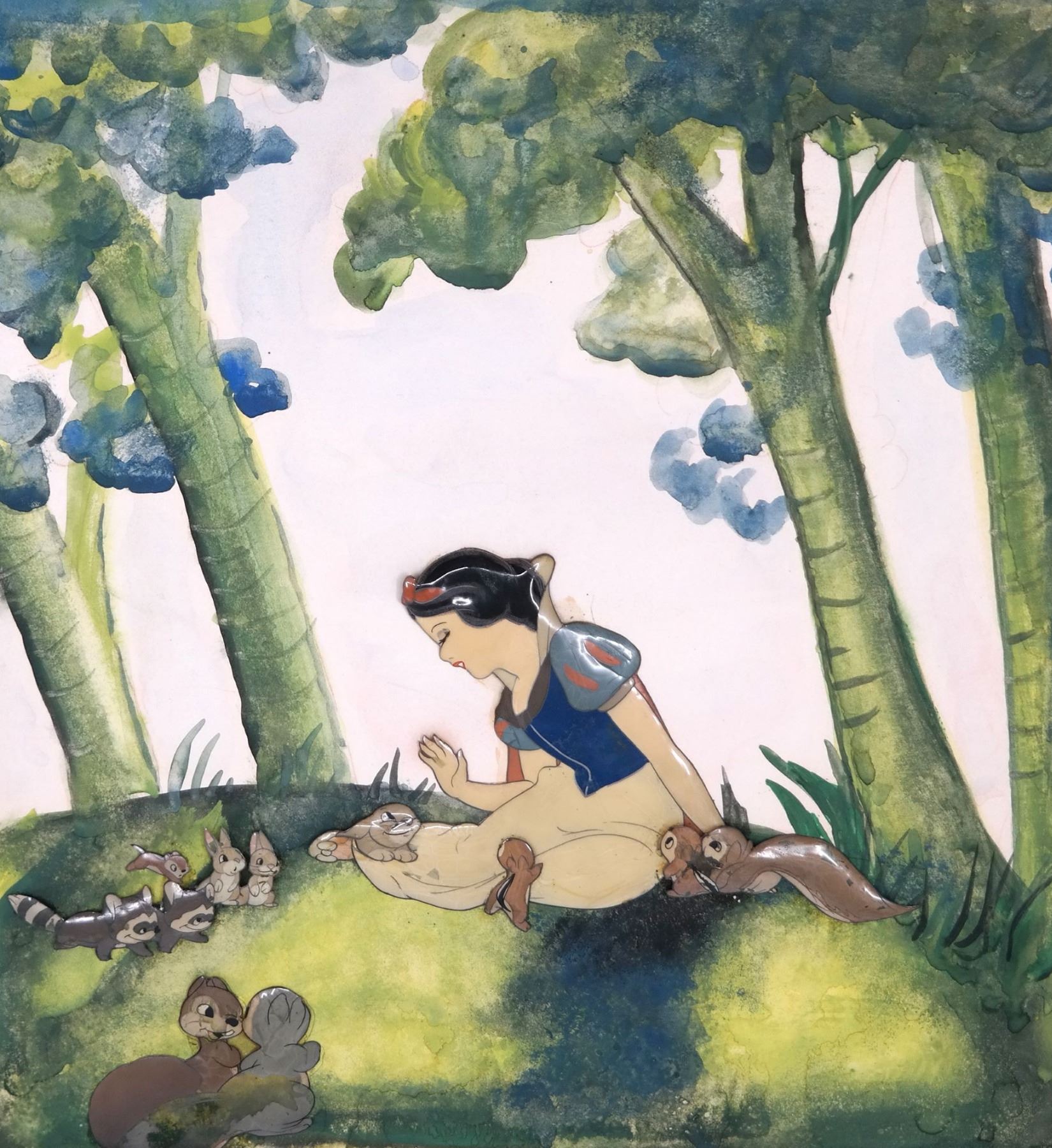 (Walt Disney Studios, 1937) An original production cel from "Snow White and the Seven Dwarfs". The cel features Snow White surrounded by several forest animals and is accomplished in gouache on celluloid. The characters have been trimmed and adhered to a hand-painted background, as originally prepared by Courvoisier Galleries. The cel has an image size of 12.25"x11.5" within a 17.5"x16.5" mat. The cel is in good condition with some paint separation and minor curving, as is typical from cels of this era. This cel still retains its original Courvoisier label on the back of the mat.