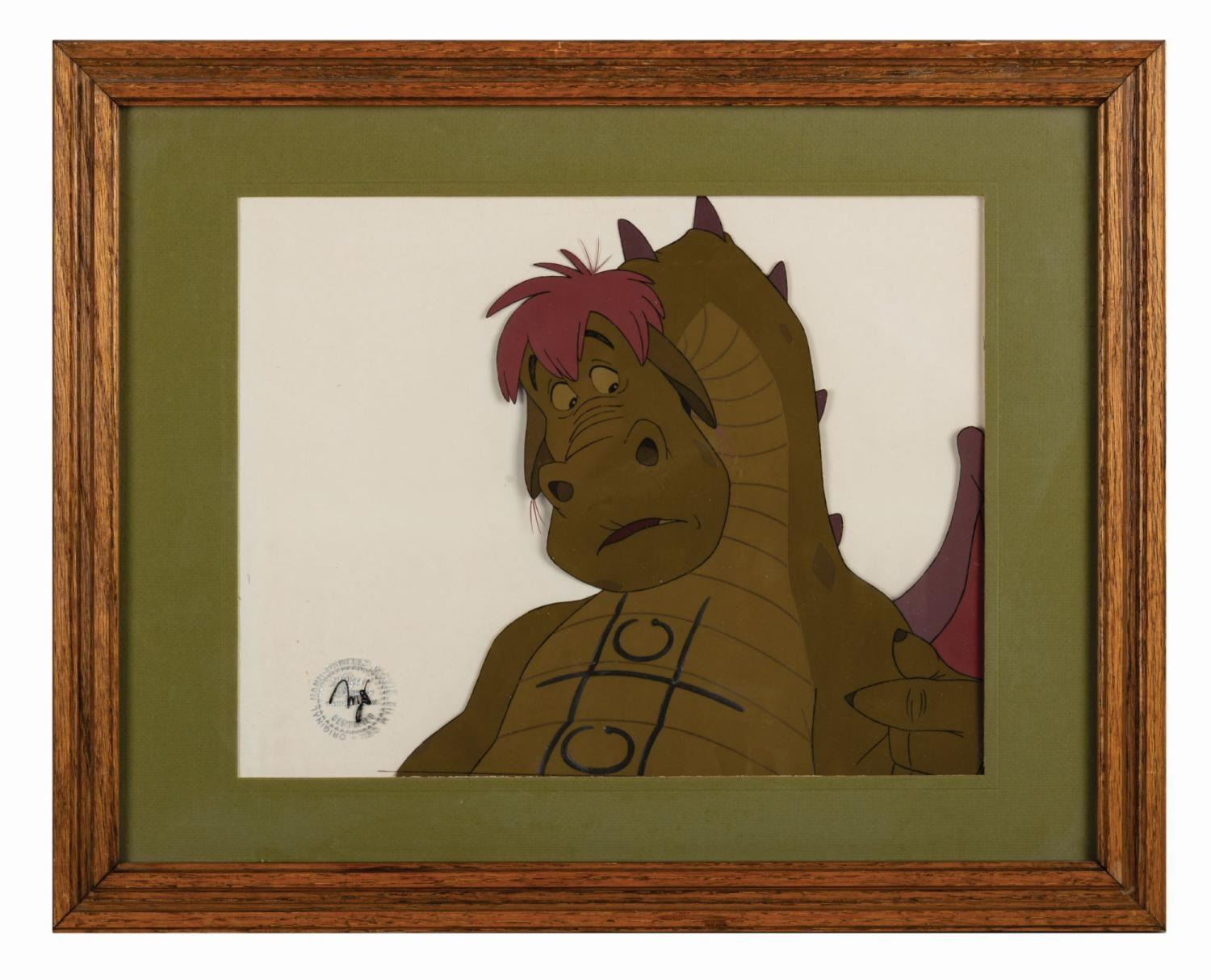 (Disney, 1977) An original hand-painted production cel of Elliott the Dragon from the Disney live action and animated adventure, Pete's Dragon. Depicting a head-and-shoulders shot of a confused Elliott, the cel retains a Walt Disney Productions seal at lower left. Measuring 10.5"x13.5" with an image size of 10.25"x10.5", the cel is presented in a 16.25"x20.25" wooden frame. In very good condition, the piece exhibits some waviness and spot pigment loss.
