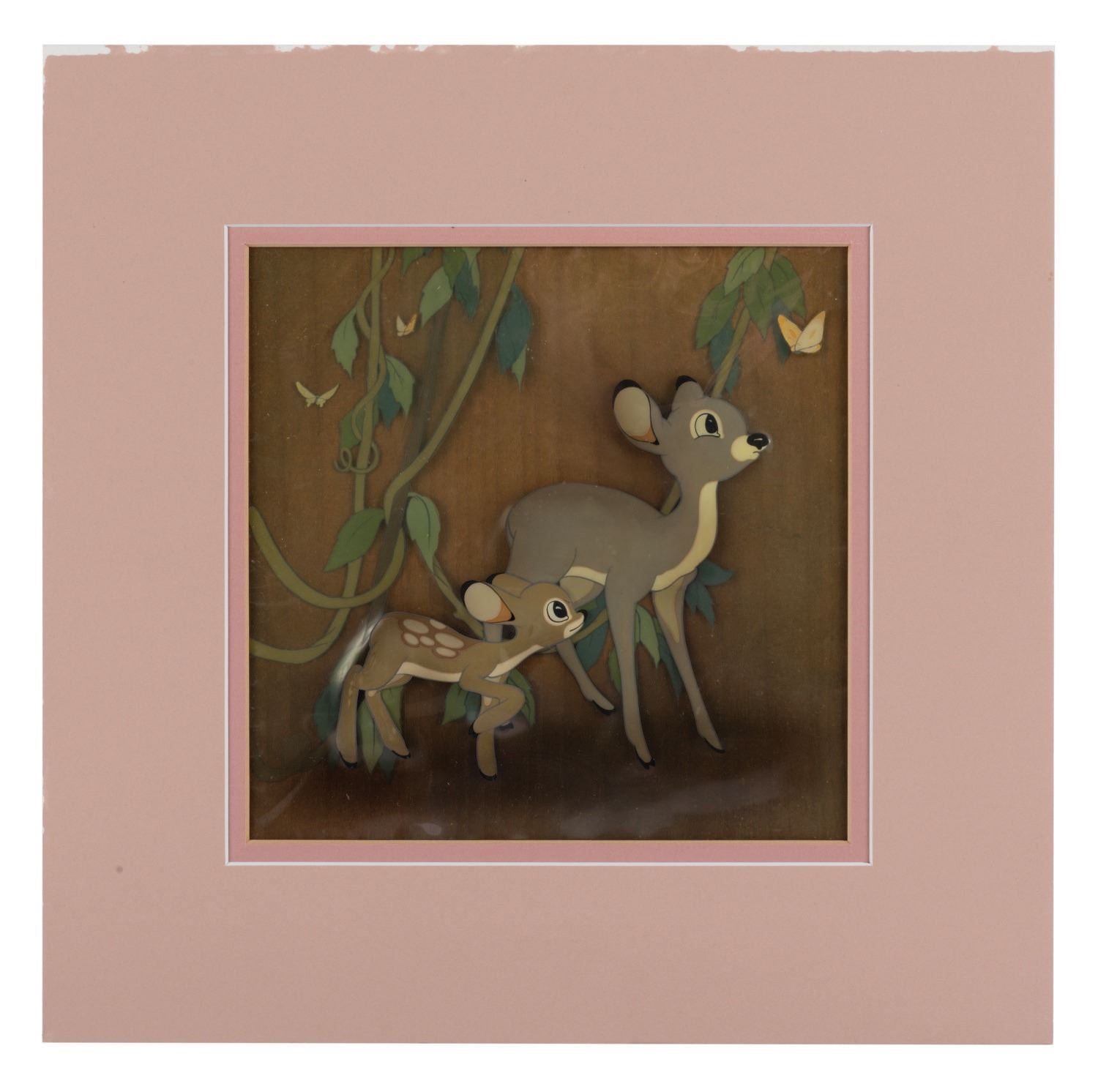 (Disney, 1937) Original Production cels of a deer, butterflies, and vines from Disney's 1937 feature film, Snow White and the Seven Dwarfs. The slightly trimmed cels have been applied to a woodgrain background as prepared for sale by Courvoisier Galleries in the late 1930's. The total image size of the two deer is 5"x5.5". The entire piece measures 8.25"x8.25" and is in fine condition with all paint intact. The original Studio label is still on the reverse.