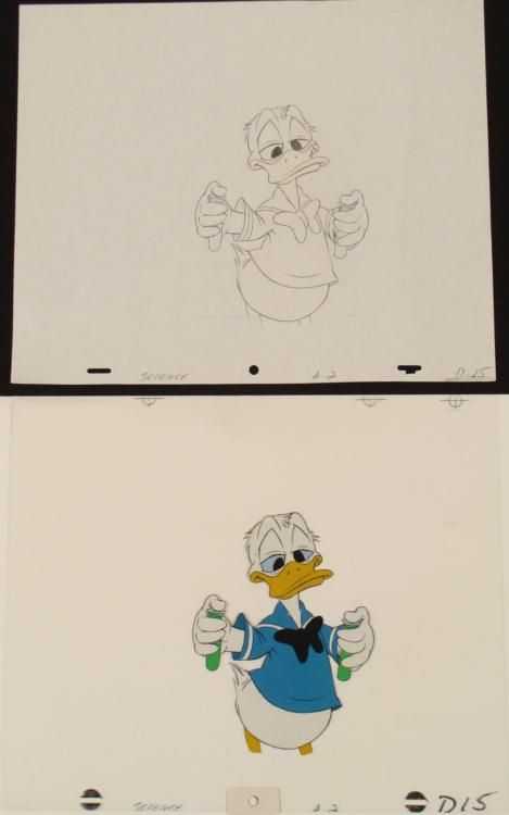 I don't think Donald should mix those two chemicals * * * * * Original Animation Cel & DrawingMedium: Hand painted acetate celDetails: Animation notations and peg holes * * Original "rough" animation drawing, in non-photo blue and black pencil * * Size of cel: 10 1/2 x 12 1/2 inchesSize of drawing: 10 1/2 x 12 1/2 inches * * Condition: Very good * This is an original hand-painted cel set-up used in the production of the "Walt Disney Shows." Each one-of-a-kind set-up represents a slight change in position of the characters. When individually photographed and projected in rapid succession, the images appear * to move. To created production cels, the original animator's drawing is transferred onto an acetate cel (by hand-inking and/or photo copying). The cel is then hand-painted on the reverse side. * * * * * Traditional animation is a multi-step process which includes various types of art techniques. Drawings are a key part of the process, in which the animator creates the design and movement of the characters. Drawings are then transferred onto acetate cels * (by hand-inking and/or photo copying) to create a production cel, which is then hand painted on the back side, using paint colors chosen and approved by the creator of the series.