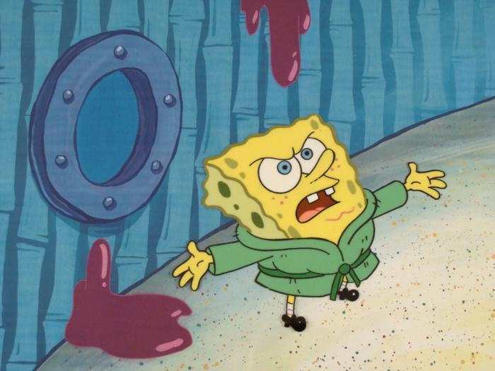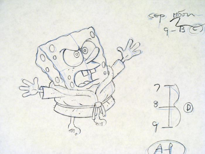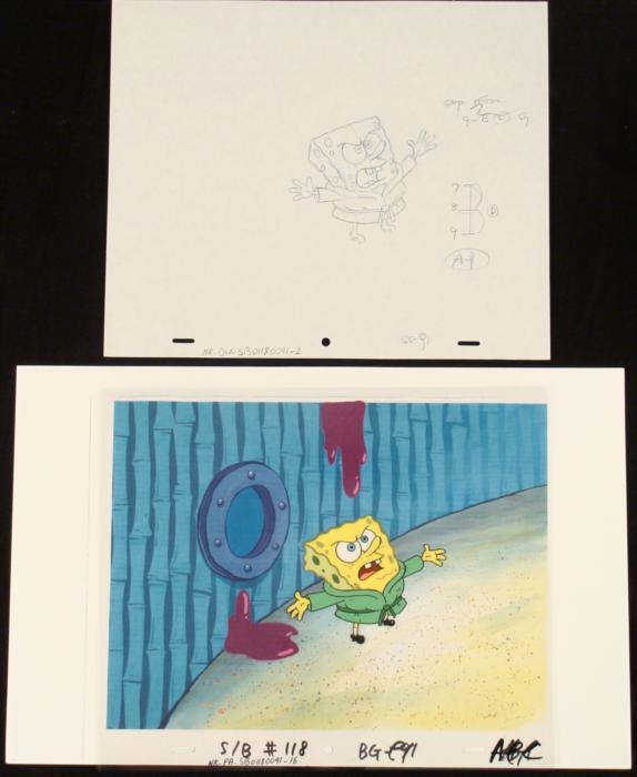 This animation cel and reproduction background and drawing are from the Nickelodeon TV show SpongeBob Squarepants. The story takes place under the deep blue sea in Bikini Bottom, where SpongeBob resides. SpongeBob, who is a yellow, porous sponge, is your typical happy-go-lucky character, as he is always cheerful and enjoys making people laugh. Patrick Star, SpongeBob's neighbor who is a starfish, is your average children's show idiot, as he boasts knowing nothing and is often getting himself into ridiculous situations. Between the homes of these two lies the home of the miserable Squidward, a squid, who is known for being grouchy and playing tricks on SpongeBob and Patrick. Both SpongeBob and Squidward work at the Krusty Krab, a fast food business run by the greedy money-loving Mr. Krabs, a crab, the arch rival of the evil, possibly misunderstood, Plankton. Another neighbor, Sandy Cheeks, an athletic squirrel who normally wears an astronaut's space suit, was introduced in "Tea at the Treedome." She spends most of her time inventing and experimenting. Why is SpongeBob in a green robe?Original Printed Background and Animated Cel Overall Size of Background: 11" x 17" Overall Size of the Cel: 10 1/2" x 12 1/2"Overall Size of the Drawing: 10 1/2" x 12 1/2"Very good condition This is an original hand-painted cel set-up used in the production of an episode of "SpongeBob SquarePants." Each one-of-a-kind set-up represents a slight change in position of the characters. When individually photographed and projected in rapid succession, the images appear to move.
