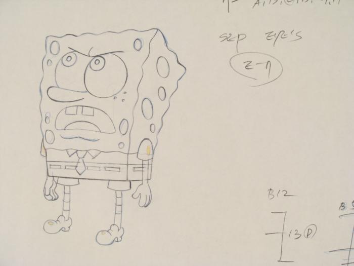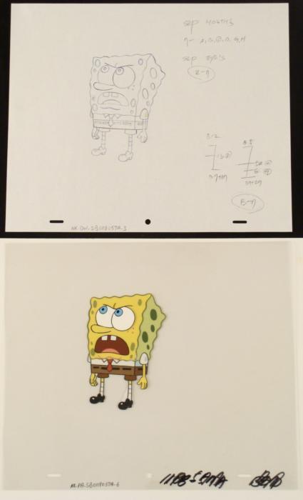 To create production cels, the original animator's drawing is transferred onto an acetate cel (by hand-inking and/or photo copying). The cel is then hand-painted on the reverse side. The cel and drawing are ready to be matted and framed. The animator's notations are at the bottom of the cel and top and bottom of the drawing. The cel is multi-layered: first is SpongeBob's eyes, then his mouth, and the last cel is SpongeBob's body.