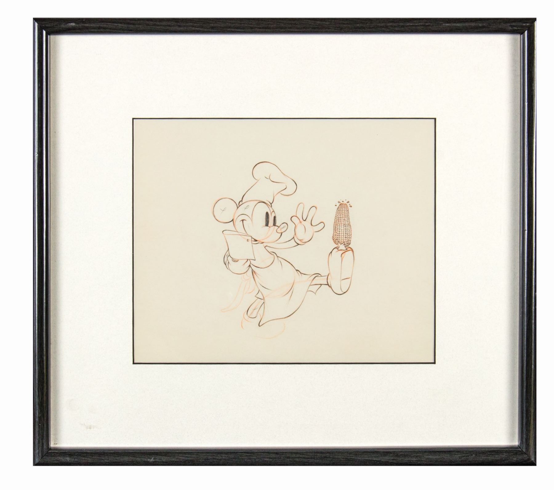 (Walt Disney Studios, 1938) An original production drawing featuring Mickey Mouse from "Mickey's Trailer." The drawing is accomplished in graphite and colored pencil on animation paper and has an image size of 8"x10" within its 15"x17" frame. The condition is very good with some scuffing to the frame.