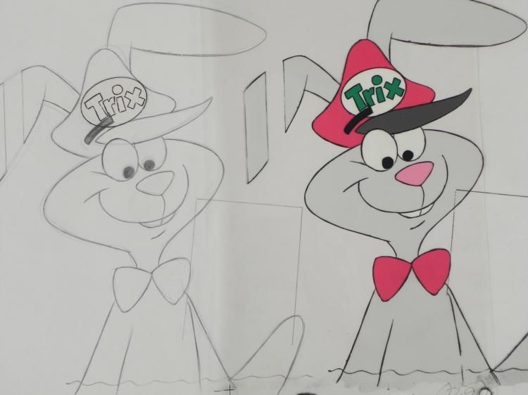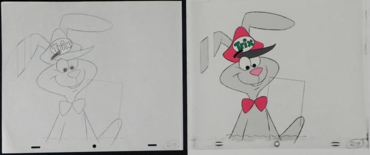 In this cel/drawing, the Trix rabbit has floppy ears. This original animation cel & drawing are from the production of the Trix cereal commercial. * * * * * * Original Animation Cel & DrawingMedium: Hand painted acetate celDetails: Animation notations and peg holes * * Original "rough" animation drawing, in non-photo blue and black pencil * * Size of cel: 10 1/2 x 12 1/2 inchesSize of drawing: 10 1/2 x 12 1/2 inches * * Condition: Very good * This is an original hand-painted cel set-up used in the production of the "Trix Cereal Commercial." Each one-of-a-kind set-up represents a slight change in position of the characters. When individually photographed and projected in rapid succession, the images * appear to move. To created production cels, the original animator's drawing is transferred onto an acetate cel (by hand-inking and/or photo copying). The cel is then hand-painted on the reverse side. * * * * * Traditional animation is a multi-step process which includes various types of art techniques. Drawings are a key part of the process, in which the animator creates the design and movement of the characters. Drawings are then transferred onto acetate cels (by * hand-inking and/or photo copying) to create a production cel, which is then hand painted on the back side, using paint colors chosen and approved by the creator of the series.