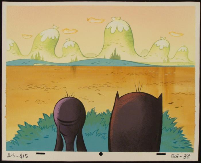This original hand-painted background is from the Nickelodeon TV show Ren & Stimpy. The show follows two characters - Ren, a crazy Chihuahua - and - Stimpy, an incredibly stupid cat - as they think up to all kinds of hair brained schemes and get themselves into some sticky situations. The Ren and Stimpy Show debuted in August 1991 with a two-part episode, 'Stimpy's Big Day / The Big Shot' and became an instant hit. It was the third Nicktoon ever to be aired on the Network alongside Doug and Rugrats. Ren and Stimpy are staring off into the distance. Original Production Background Overall Size: 10 1/2" x 13" Very good condition; it has been storedOriginal Production Backgrounds are used in the making of the final version of animated productions. The background establishes the location and the overall good mood of the scenee. Typically, a background layout artist creates a drawing to establish the content of the scene, placement of characters, perspective and camera angle. Based on this drawing, the background artist creates a preliminary painting to confirm all of the scenes details, then the final production background which is used in the filming of the scene. When these backgrounds are individually photographed behind the progression of production cels, and projected at a rapid succession, the images in the foreground appear to move, creating an animated scene. The background is to be matted and framed. It is a colored background with the animator's notations shown at the bottom.