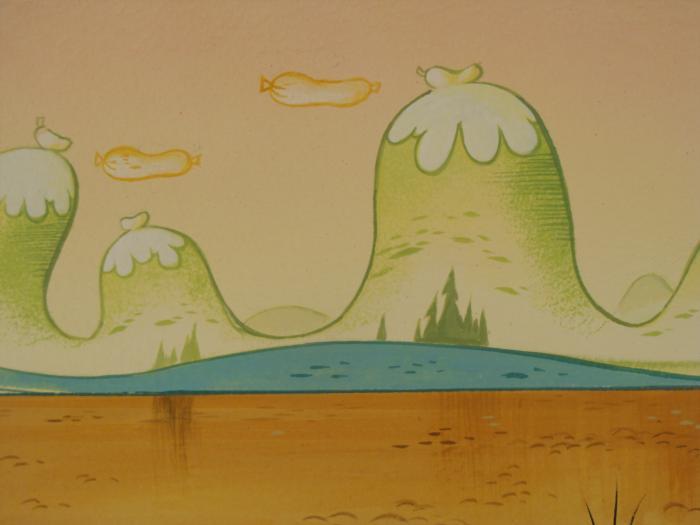 This original hand-painted background is from the Nickelodeon TV show Ren & Stimpy. The show follows two characters - Ren, a crazy Chihuahua - and - Stimpy, an incredibly stupid cat - as they think up to all kinds of hair brained schemes and get themselves into some sticky situations. The Ren and Stimpy Show debuted in August 1991 with a two-part episode, 'Stimpy's Big Day / The Big Shot' and became an instant hit. It was the third Nicktoon ever to be aired on the Network alongside Doug and Rugrats. Ren and Stimpy are staring off into the distance. Original Production Background Overall Size: 10 1/2" x 13" Very good condition; it has been storedOriginal Production Backgrounds are used in the making of the final version of animated productions. The background establishes the location and the overall good mood of the scenee. Typically, a background layout artist creates a drawing to establish the content of the scene, placement of characters, perspective and camera angle. Based on this drawing, the background artist creates a preliminary painting to confirm all of the scenes details, then the final production background which is used in the filming of the scene. When these backgrounds are individually photographed behind the progression of production cels, and projected at a rapid succession, the images in the foreground appear to move, creating an animated scene. The background is to be matted and framed. It is a colored background with the animator's notations shown at the bottom.