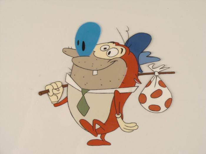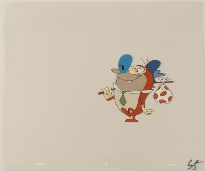This is an original production animation cel from the Nickelodeon TV show Ren & Stimpy. The show follows two characters - Ren, a crazy Chihuahua - and - Stimpy, an incredibly stupid cat - as they think up to all kinds of hair brained schemes and get themselves into some sticky situations. The Ren and Stimpy Show debuted in August 1991 with a two-part episode, 'Stimpy's Big Day / The Big Shot' and became an instant hit. It was the third Nicktoon ever to be aired on the Network alongside Doug and Rugrats. It appears Stimpy is hitchhiking somewhere.Original Production Art Cel Overall Size of the Cel: 10 1/2" x 12 1/2" Excellent condition This is an original hand-painted cel set-up used in the production of an episode of "The Ren & Stimpy Show." Each one-of-a-kind set-up represents a slight change in position of the characters. When individually photographed and projected in rapid succession, the images appear to move.