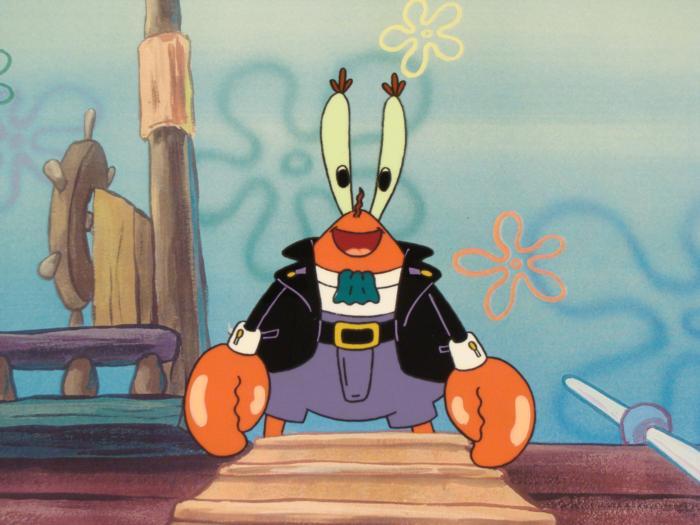 This animation cel and reproduction background are from the Nickelodeon TV show SpongeBob Squarepants. The story takes place under the deep blue sea in Bikini Bottom, where SpongeBob resides. SpongeBob, who is a yellow, porous sponge, is your typical happy-go-lucky character, as he is always cheerful and enjoys making people laugh. Patrick Star, SpongeBob's neighbor who is a starfish, is your average children's show idiot, as he boasts knowing nothing and is often getting himself into ridiculous situations. Between the homes of these two lies the home of the miserable Squidward, a squid, who is known for being grouchy and playing tricks on SpongeBob and Patrick. Both SpongeBob and Squidward work at the Krusty Krab, a fast food business run by the greedy money-loving Mr. Krabs, a crab, the arch rival of the evil, possibly misunderstood, Plankton. Another neighbor, Sandy Cheeks, an athletic squirrel who normally wears an astronaut's space suit, was introduced in "Tea at the Treedome." She spends most of her time inventing and experimenting. Mr. Krabs looks very excited.Original Printed Background and Animated Cel Overall Size of Background: 11" x 17" Overall Size of the Cel: 10 1/2" x 12 1/2" Very good condition; it has been storedThis is an original hand-painted cel set-up used in the production of an episode of "SpongeBob SquarePants." Each one-of-a-kind set-up represents a slight change in position of the characters. When individually photographed and projected in rapid succession, the images appear to move.
