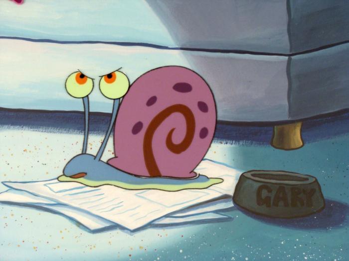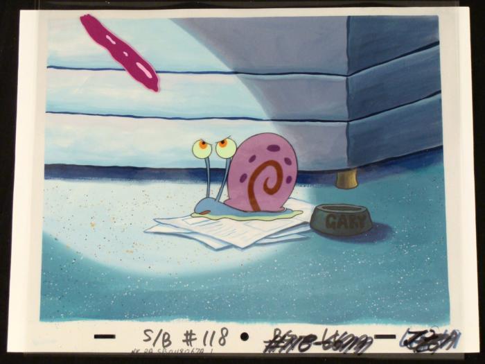 This animation cel and reproduction background are from the Nickelodeon TV show SpongeBob Squarepants. The story takes place under the deep blue sea in Bikini Bottom, where SpongeBob resides. SpongeBob, who is a yellow, porous sponge, is your typical happy-go-lucky character, as he is always cheerful and enjoys making people laugh. Patrick Star, SpongeBob's neighbor who is a starfish, is your average children's show idiot, as he boasts knowing nothing and is often getting himself into ridiculous situations. Between the homes of these two lies the home of the miserable Squidward, a squid, who is known for being grouchy and playing tricks on SpongeBob and Patrick. Both SpongeBob and Squidward work at the Krusty Krab, a fast food business run by the greedy money-loving Mr. Krabs, a crab, the arch rival of the evil, possibly misunderstood, Plankton. Another neighbor, Sandy Cheeks, an athletic squirrel who normally wears an astronaut's space suit, was introduced in "Tea at the Treedome." She spends most of her time inventing and experimenting. Gary is laying on his newspaper bed.Original Printed Background and Animated Cel Overall Size of Background: 11" x 17" Overall Size of the Cel: 10 1/2" x 12 1/2" Very good condition This is an original hand-painted cel set-up used in the production of an episode of "SpongeBob SquarePants." Each one-of-a-kind set-up represents a slight change in position of the characters. When individually photographed and projected in rapid succession, the images appear to move.
