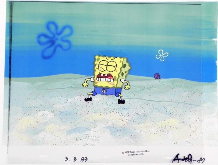 Normal 0 false false false MicrosoftInternetExplorer4 /* Style Definitions */ table.MsoNormalTable{mso-style-name:"Table Normal";mso-tstyle-rowband-size:0;mso-tstyle-colband-size:0;mso-style-noshow:yes;mso-style-parent:"";mso-padding-alt:0in 5.4pt 0in 5.4pt;mso-para-margin:0in;mso-para-margin-bottom:.0001pt;mso-pagination:widow-orphan;font-size:10.0pt;font-family:"Times New Roman";mso-ansi-language:#0400;mso-fareast-language:#0400;mso-bidi-language:#0400;}This animation cel and reproduction background are from the Nickelodeon TV show SpongeBob Squarepants. The story takes place under the deep blue sea in Bikini Bottom, where SpongeBob resides. SpongeBob, who is a yellow, porous sponge, is your typical happy-go-lucky character, as he is always cheerful and enjoys making people laugh. Patrick Star, SpongeBob's neighbor who is a starfish, is your average children's show idiot, as he boasts knowing nothing and is often getting himself into ridiculous situations.Between the homes of these two lies the home of the miserable Squidward, a squid, who is known for being grouchy and playing tricks on SpongeBob and Patrick. Both SpongeBob and Squidward work at the Krusty Krab, a fast food business run by the greedy money-loving Mr. Krabs, a crab, the arch rival of the evil, possibly misunderstood, Plankton. Another neighbor, Sandy Cheeks, an athletic squirrel who normally wears an astronaut's space suit, was introduced in "Tea at the Treedome." She spends most of her time inventing and experimenting. * Those are not the rules of the game, STOP CHEATING!!! * * Original Printed Background and Animated Cel Overall Size of Background: 11" x 17" Overall Size of the Cel: 10 1/2" x 12 1/2" Excellent condition This is an original hand-painted cel set-up used in the production of an episode of "SpongeBob SquarePants." Each one-of-a-kind set-up represents a slight change in position of the characters. When individually photographed and projected in rapid succession, the images appear to move. * To create production cels, the original animator's drawing is transferred onto an acetate cel (by hand-inking and/or photo copying). The cel is then hand-painted on the reverse side. The background accompanying this set-up is a reproduction background. * The printed background and cel are ready to be matted and framed. The notations are located at the bottom of both. * *