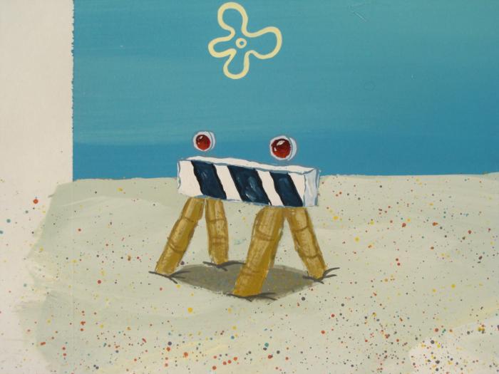 This original hand-painted background from the Nickelodeon TV show SpongeBob Squarepants. The story takes place under the deep blue sea in Bikini Bottom, where SpongeBob resides. SpongeBob, who is a yellow, porous sponge, is your typical happy-go-lucky character, as he is always cheerful and enjoys making people laugh. Patrick Star, SpongeBob's neighbor who is a starfish, is your average children's show idiot, as he boasts knowing nothing and is often getting himself into ridiculous situations. Between the homes of these two lies the home of the miserable Squidward, a squid, who is known for being grouchy and playing tricks on SpongeBob and Patrick. Both SpongeBob and Squidward work at the Krusty Krab, a fast food business run by the greedy money-loving Mr. Krabs, a crab, the arch rival of the evil, possibly misunderstood, Plankton. Another neighbor, Sandy Cheeks, an athletic squirrel who normally wears an astronaut's space suit, was introduced in "Tea at the Treedome." She spends most of her time inventing and experimenting. There is a road block at the beach.Original Production Background Overall Size of Background: 10 1/2" x 13 3/4" Very good conditionOriginal Production Backgrounds are used in the making of the final version of animated productions. The background establishes the location and the overall good mood of the scenee. Typically, a background layout artist creates a drawing to establish the content of the scene, placement of characters, perspective and camera angle. Based on this drawing, the background artist creates a preliminary painting to confirm all of the scenes details, then the final production background which is used in the filming of the scene. When these backgrounds are individually photographed behind the progression of production cels, and projected at a rapid succession, the images in the foreground appear to move, creating an animated scene. The background is ready to be matted and framed. It is a colored background with the animator's notations at the bottom.