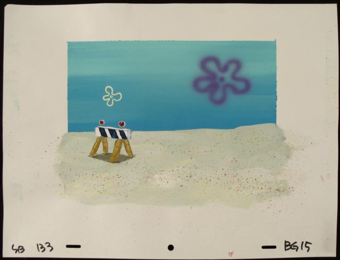 This original hand-painted background from the Nickelodeon TV show SpongeBob Squarepants. The story takes place under the deep blue sea in Bikini Bottom, where SpongeBob resides. SpongeBob, who is a yellow, porous sponge, is your typical happy-go-lucky character, as he is always cheerful and enjoys making people laugh. Patrick Star, SpongeBob's neighbor who is a starfish, is your average children's show idiot, as he boasts knowing nothing and is often getting himself into ridiculous situations. Between the homes of these two lies the home of the miserable Squidward, a squid, who is known for being grouchy and playing tricks on SpongeBob and Patrick. Both SpongeBob and Squidward work at the Krusty Krab, a fast food business run by the greedy money-loving Mr. Krabs, a crab, the arch rival of the evil, possibly misunderstood, Plankton. Another neighbor, Sandy Cheeks, an athletic squirrel who normally wears an astronaut's space suit, was introduced in "Tea at the Treedome." She spends most of her time inventing and experimenting. There is a road block at the beach.Original Production Background Overall Size of Background: 10 1/2" x 13 3/4" Very good conditionOriginal Production Backgrounds are used in the making of the final version of animated productions. The background establishes the location and the overall good mood of the scenee. Typically, a background layout artist creates a drawing to establish the content of the scene, placement of characters, perspective and camera angle. Based on this drawing, the background artist creates a preliminary painting to confirm all of the scenes details, then the final production background which is used in the filming of the scene. When these backgrounds are individually photographed behind the progression of production cels, and projected at a rapid succession, the images in the foreground appear to move, creating an animated scene. The background is ready to be matted and framed. It is a colored background with the animator's notations at the bottom.