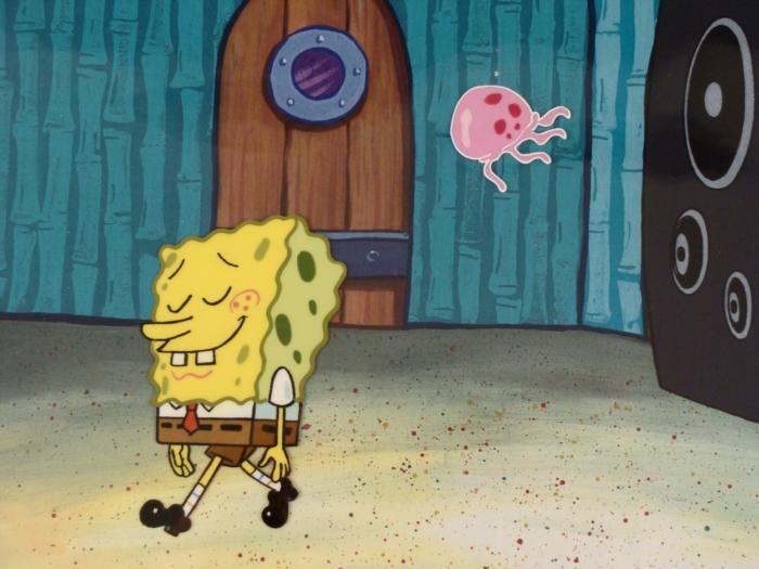 To create production cels, the original animator's drawing is transferred onto an acetate cel (by hand-inking and/or photo copying). The cel is then hand-painted on the reverse side. The printed background is ready to be matted and framed. It is a colored background with a cel and has the animator's notations at the bottom of the background and the cel. The background is a printed reproduction background. The cel has multiple layers; first is the jellyfish and the second cel is SpongeBob.