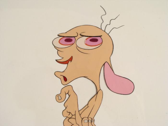 This is an original production animation cel from the Nickelodeon TV show Ren & Stimpy. The show follows two characters - Ren, a crazy Chihuahua - and - Stimpy, an incredibly stupid cat - as they think up to all kinds of hair brained schemes and get themselves into some sticky situations. The Ren and Stimpy Show debuted in August 1991 with a two-part episode, 'Stimpy's Big Day / The Big Shot' and became an instant hit. It was the third Nicktoon ever to be aired on the Network alongside Doug and Rugrats. Ren is in deep thoughtOriginal Production Art Cel Overall Size of the Cel: 10 1/2" x 1/2" Very Good condition This is an original hand-painted cel set-up used in the production of an episode of "The Ren & Stimpy Show." Each one-of-a-kind set-up represents a slight change in position of the characters. When individually photographed and projected in rapid succession, the images appear to move.