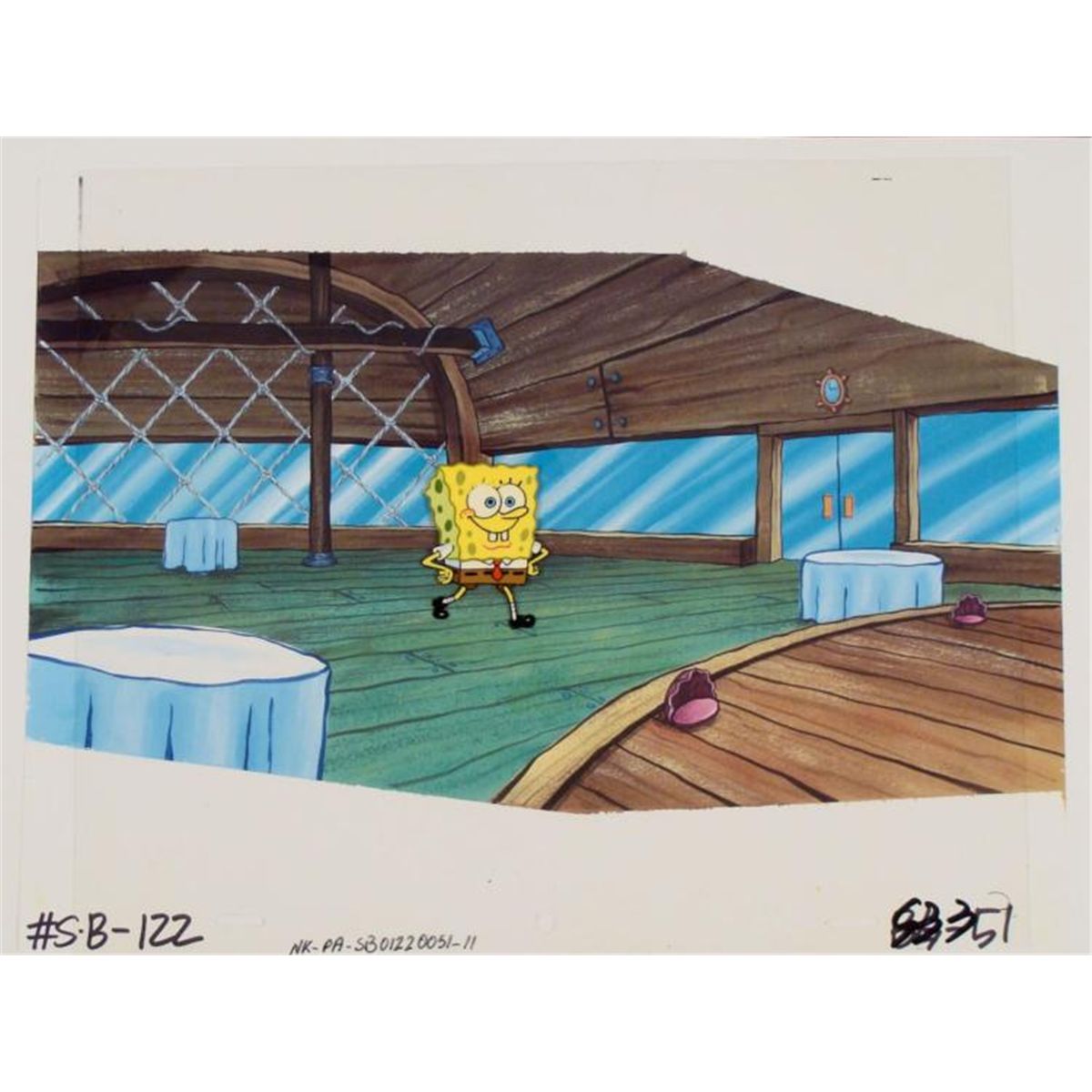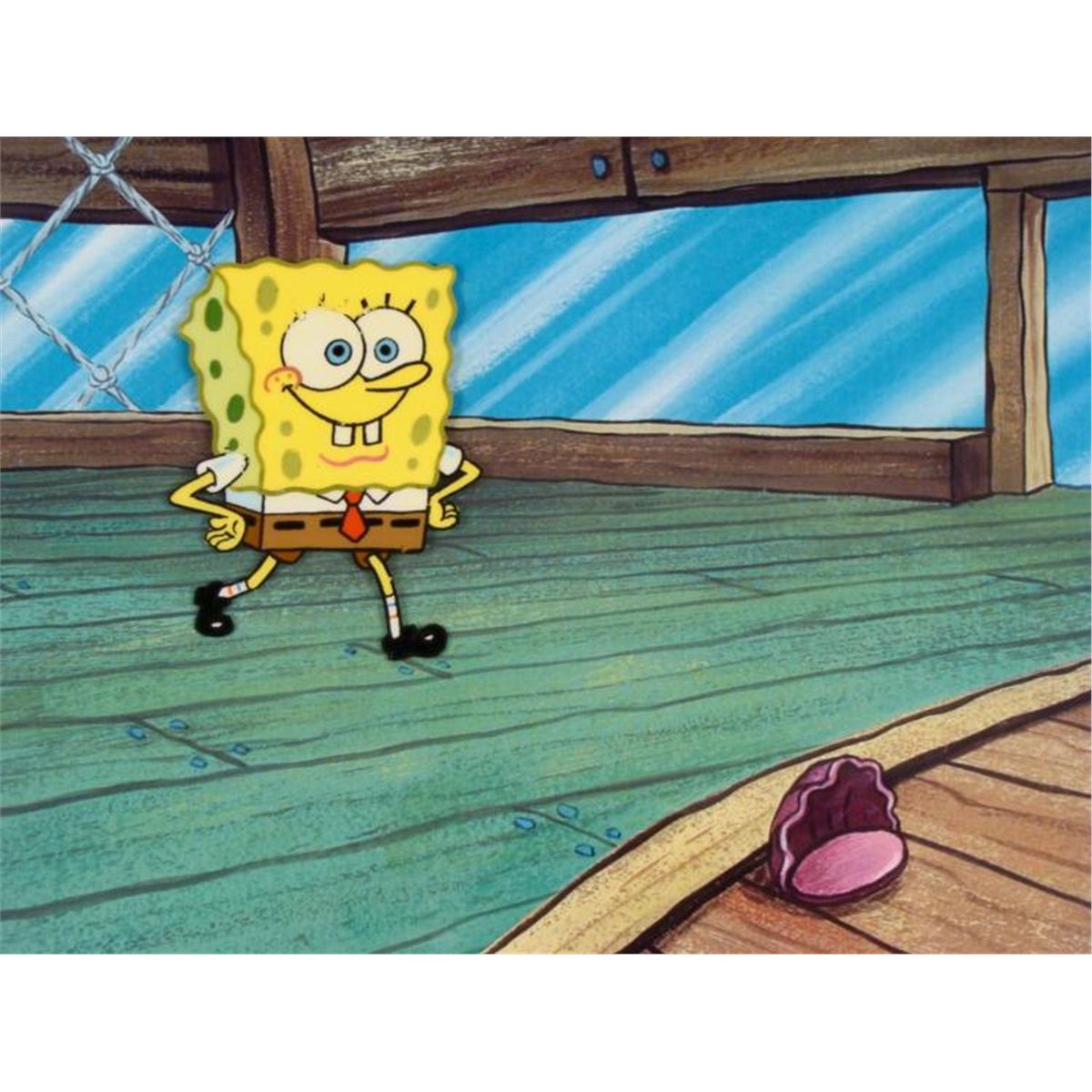 This animation cel and reproduction background are from the Nickelodeon TV show SpongeBob Squarepants. The story takes place under the deep blue sea in Bikini Bottom, where SpongeBob resides. SpongeBob, who is a yellow, porous sponge, is your typical happy-go-lucky character, as he is always cheerful and enjoys making people laugh. Patrick Star, SpongeBob's neighbor who is a starfish, is your average children's show idiot, as he boasts knowing nothing and is often getting himself into ridiculous situations. Between the homes of these two lies the home of the miserable Squidward, a squid, who is known for being grouchy and playing tricks on SpongeBob and Patrick. Both SpongeBob and Squidward work at the Krusty Krab, a fast food business run by the greedy money-loving Mr. Krabs, a crab, the arch rival of the evil, possibly misunderstood, Plankton. Another neighbor, Sandy Cheeks, an athletic squirrel who normally wears an astronaut's space suit, was introduced in "Tea at the Treedome." She spends most of her time inventing and experimenting. * Crazy boy * Original Printed Background and Animation Cel Overall Size of Background: 11" x 17" Overall Size of the Cel: 10 1/2" x 12 1/2" Very good condition This is an original hand-painted cel set-up used in the production of an episode of "SpongeBob SquarePants." Each one-of-a-kind set-up represents a slight change in position of the characters. When individually photographed and projected in rapid succession, the images appear to move. * To create production cels, the original animator's drawing is transferred onto an acetate cel (by hand-inking and/or photo copying). The cel is then hand-painted on the reverse side. * The printed background is ready to be matted and framed. It is a colored background with a cel and has the animator's notations at the bottom of the background and the cel. The background is a printed reproduction background. There is some slight paint fade to SpongeBob's outline. * *