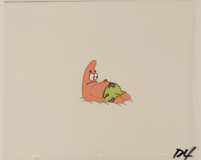 To create production cels, the original animator's drawing is transferred onto an acetate cel (by hand-inking and/or photo copying). The cel is then hand-painted on the reverse side. The cel received by the winning bidder may be ever so slightly different from the one in the auction photos. The cel is ready to be matted and framed. The animator's notations are at the bottom of the cel. There is some slight paint fade to Patrick's outline.