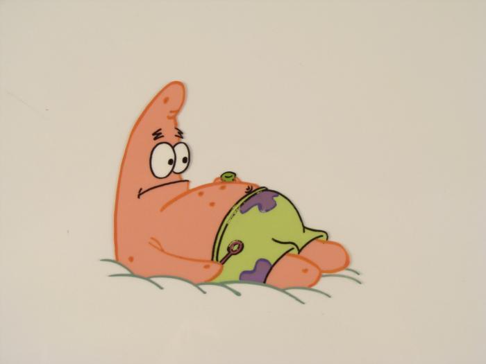 This original animation cel is from the Nickelodeon TV show SpongeBob Squarepants. The story takes place under the deep blue sea in Bikini Bottom, where SpongeBob resides. SpongeBob, who is a yellow, porous sponge, is your typical happy-go-lucky character, as he is always cheerful and enjoys making people laugh. Patrick Star, SpongeBob's neighbor who is a starfish, is your average children's show idiot, as he boasts knowing nothing and is often getting himself into ridiculous situations. Between the homes of these two lies the home of the miserable Squidward, a squid, who is known for being grouchy and playing tricks on SpongeBob and Patrick. Both SpongeBob and Squidward work at the Krusty Krab, a fast food business run by the greedy money-loving Mr. Krabs, a crab, the arch rival of the evil, possibly misunderstood, Plankton. Another neighbor, Sandy Cheeks, an athletic squirrel who normally wears an astronaut's space suit, was introduced in "Tea at the Treedome." She spends most of her time inventing and experimenting. Patrick is blowing bubbles.Original Production Animated Cel Overall Size of Cel: 10 1/2" x 12 1/2" Very Good ConditionThis is an original hand-painted cel set-up used in the production of an episode of "SpongeBob SquarePants." Each one-of-a-kind set-up represents a slight change in position of the characters. When individually photographed and projected in rapid succession, the images appear to move.