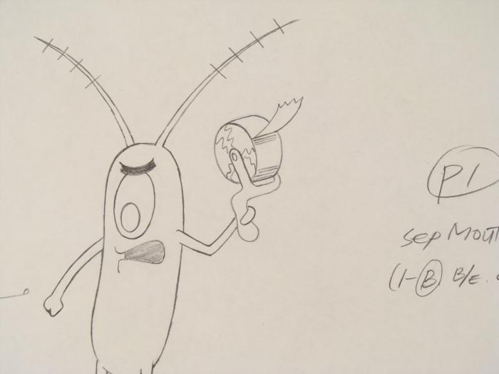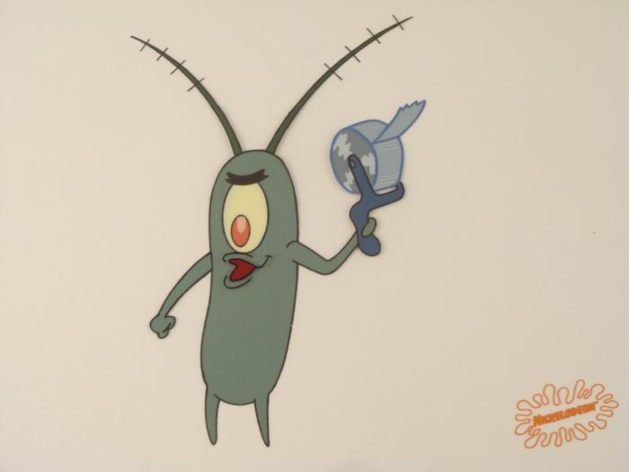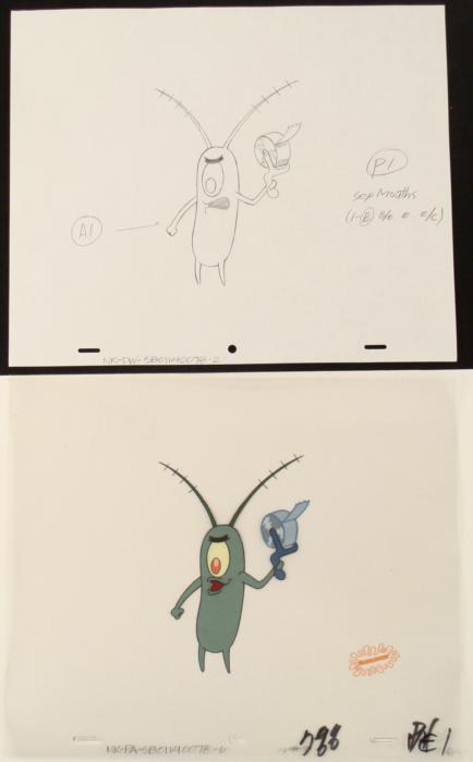 This original animation cel is from the Nickelodeon TV show SpongeBob Squarepants. The story takes place under the deep blue sea in Bikini Bottom, where SpongeBob resides. SpongeBob, who is a yellow, porous sponge, is your typical happy-go-lucky character, as he is always cheerful and enjoys making people laugh. Patrick Star, SpongeBob's neighbor who is a starfish, is your average children's show idiot, as he boasts knowing nothing and is often getting himself into ridiculous situations. Between the homes of these two lies the home of the miserable Squidward, a squid, who is known for being grouchy and playing tricks on SpongeBob and Patrick. Both SpongeBob and Squidward work at the Krusty Krab, a fast food business run by the greedy money-loving Mr. Krabs, a crab, the arch rival of the evil, possibly misunderstood, Plankton. Another neighbor, Sandy Cheeks, an athletic squirrel who normally wears an astronaut's space suit, was introduced in "Tea at the Treedome." She spends most of her time inventing and experimenting. Shown here is Plankton looking evil.Original Production Animated Cel and Drawing Original "rough" animation drawing, in black pencil, with notations in black pencil. Overall Size of Drawing: 10 1/2" x 12 1/2" Overall Size of Cel: 10 1/2" x 12 1/2" Very Good ConditionThis is an original hand-painted cel set-up used in the production of an episode of "SpongeBob SquarePants." Each one-of-a-kind set-up represents a slight change in position of the characters. When individually photographed and projected in rapid succession, the images appear to move.