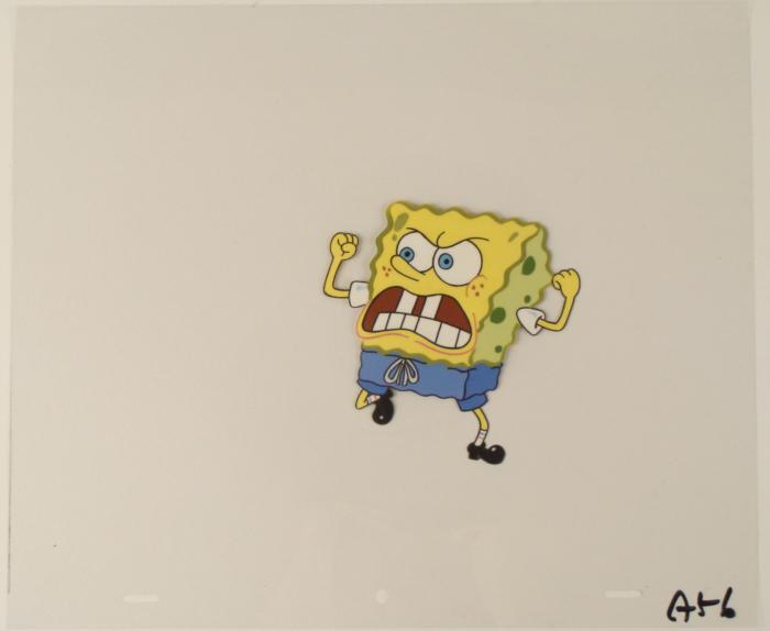 This original animation cel is from the Nickelodeon TV show SpongeBob Squarepants. The story takes place under the deep blue sea in Bikini Bottom, where SpongeBob resides. SpongeBob, who is a yellow, porous sponge, is your typical happy-go-lucky character, as he is always cheerful and enjoys making people laugh. Patrick Star, SpongeBob's neighbor who is a starfish, is your average children's show idiot, as he boasts knowing nothing and is often getting himself into ridiculous situations. Between the homes of these two lies the home of the miserable Squidward, a squid, who is known for being grouchy and playing tricks on SpongeBob and Patrick. Both SpongeBob and Squidward work at the Krusty Krab, a fast food business run by the greedy money-loving Mr. Krabs, a crab, the arch rival of the evil, possibly misunderstood, Plankton. Another neighbor, Sandy Cheeks, an athletic squirrel who normally wears an astronaut's space suit, was introduced in "Tea at the Treedome." She spends most of her time inventing and experimenting. SpongeBob seems to be furiousOriginal Production Animated Cel Overall Size of Cel: 10 1/2" x 12 1/2" Very Good ConditionThis is an original hand-painted cel set-up used in the production of an episode of "SpongeBob SquarePants." Each one-of-a-kind set-up represents a slight change in position of the characters. When individually photographed and projected in rapid succession, the images appear to move.