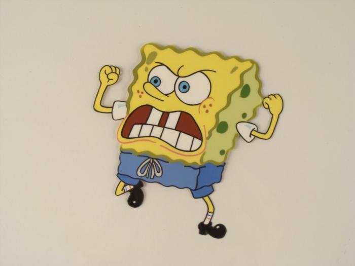 This original animation cel is from the Nickelodeon TV show SpongeBob Squarepants. The story takes place under the deep blue sea in Bikini Bottom, where SpongeBob resides. SpongeBob, who is a yellow, porous sponge, is your typical happy-go-lucky character, as he is always cheerful and enjoys making people laugh. Patrick Star, SpongeBob's neighbor who is a starfish, is your average children's show idiot, as he boasts knowing nothing and is often getting himself into ridiculous situations. Between the homes of these two lies the home of the miserable Squidward, a squid, who is known for being grouchy and playing tricks on SpongeBob and Patrick. Both SpongeBob and Squidward work at the Krusty Krab, a fast food business run by the greedy money-loving Mr. Krabs, a crab, the arch rival of the evil, possibly misunderstood, Plankton. Another neighbor, Sandy Cheeks, an athletic squirrel who normally wears an astronaut's space suit, was introduced in "Tea at the Treedome." She spends most of her time inventing and experimenting. SpongeBob seems to be furiousOriginal Production Animated Cel Overall Size of Cel: 10 1/2" x 12 1/2" Very Good ConditionThis is an original hand-painted cel set-up used in the production of an episode of "SpongeBob SquarePants." Each one-of-a-kind set-up represents a slight change in position of the characters. When individually photographed and projected in rapid succession, the images appear to move.