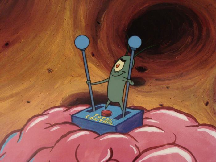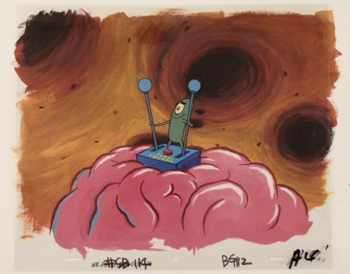 To create production cels, the original animator's drawing is transferred onto an acetate cel (by hand-inking and/or photo copying). The cel is then hand-painted on the reverse side. The background accompanying this set-up is a hand-painted original production background. The printed background is ready to be matted and framed. It is a colored background with a cel and has the animator's notations at the bottom of the background and the cel. The background is a printed reproduction background. The cel has multiple layers; first is a cel of a part of Plankton's eye and the second cel is Plankton.