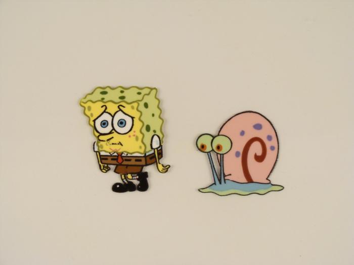 This original animation cel is from the Nickelodeon TV show SpongeBob Squarepants. The story takes place under the deep blue sea in Bikini Bottom, where SpongeBob resides. SpongeBob, who is a yellow, porous sponge, is your typical happy-go-lucky character, as he is always cheerful and enjoys making people laugh. Patrick Star, SpongeBob's neighbor who is a starfish, is your average children's show idiot, as he boasts knowing nothing and is often getting himself into ridiculous situations. Between the homes of these two lies the home of the miserable Squidward, a squid, who is known for being grouchy and playing tricks on SpongeBob and Patrick. Both SpongeBob and Squidward work at the Krusty Krab, a fast food business run by the greedy money-loving Mr. Krabs, a crab, the arch rival of the evil, possibly misunderstood, Plankton. Another neighbor, Sandy Cheeks, an athletic squirrel who normally wears an astronaut's space suit, was introduced in "Tea at the Treedome." She spends most of her time inventing and experimenting. Why the long face?Original Production Animated Cel Overall Size of Cel: 10 1/2" x 12 1/2" Very Good ConditionThis is an original hand-painted cel set-up used in the production of an episode of "SpongeBob SquarePants." Each one-of-a-kind set-up represents a slight change in position of the characters. When individually photographed and projected in rapid succession, the images appear to move.