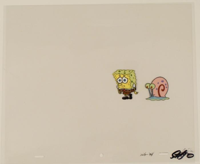 To create production cels, the original animator's drawing is transferred onto an acetate cel (by hand-inking and/or photo copying). The cel is then hand-painted on the reverse side. The cel received by the winning bidder may be ever so slightly different from the one in the auction photos. The cel is ready to be matted and framed. The animator's notations are at the bottom of the cel. There is some slight paint fade to SpongeBob's outline. The cel has multiple layers; first is SpongeBob and the second cel is Gary.