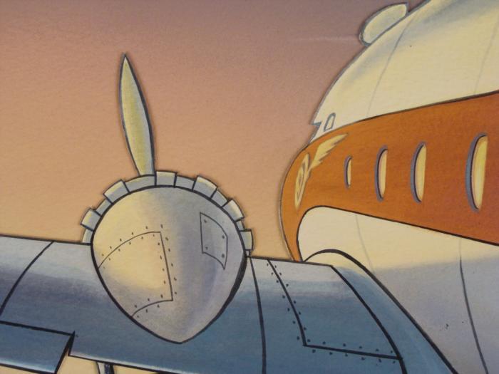This original production art cel and background is from the Nickelodeon TV show Ren & Stimpy. The show follows two characters - Ren, a crazy Chihuahua - and - Stimpy, an incredibly stupid cat - as they think up to all kinds of hair brained schemes and get themselves into some sticky situations. The Ren and Stimpy Show debuted in August 1991 with a two-part episode, 'Stimpy's Big Day / The Big Shot' and became an instant hit. It was the third Nicktoon ever to be aired on the Network alongside Doug and Rugrats. Side of plane in the sunsetOriginal Production Art CelOriginal Production Background Overall Size: 10 1/2" x 13"Very Good condition This is an original hand-painted cel set-up used in the production of an episode of "The Ren & Stimpy Show." Each one-of-a-kind set-up represents a slight change in position of the characters. When individually photographed and projected in rapid succession, the images appear to move.